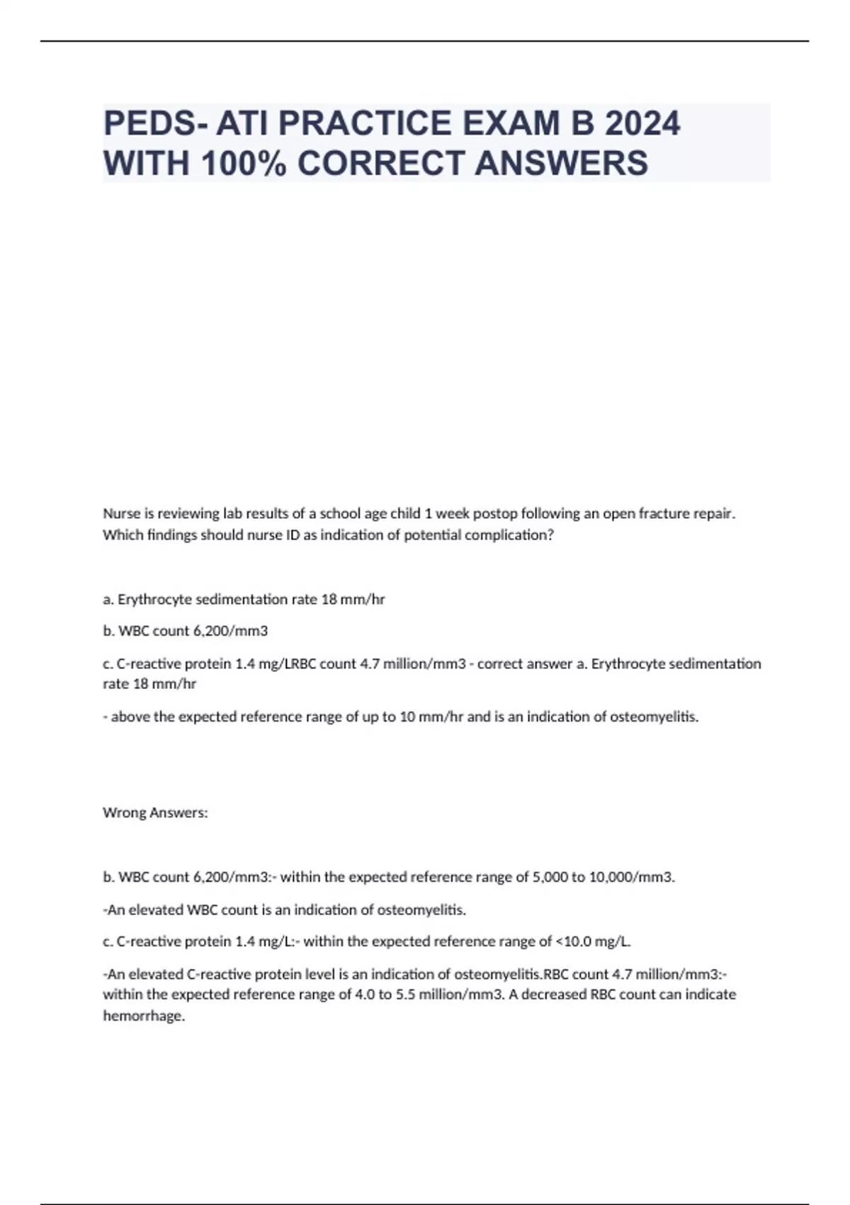 Nurse is reviewing lab results of a school age child 1 week postop following an open fracture repair. Which findings should nurse ID as indication of potential complication? a. Erythrocyte sedimentation rate 18 mm/hr b. WBC count 6,200/mm3 c. C-reactive protein 1.4 mg/LRBC count 4.7 million/mm3 - correct answer a. Erythrocyte sedimentation rate 18 mm/hr - above the expected reference range of up to 10 mm/hr and is an indication of osteomyelitis. Wrong Answers: b. WBC count 6,200/mm3:- within the expected reference range of 5,000 to 10,000/mm3. -An elevated WBC count is an indication of osteomyelitis. c. C-reactive protein 1.4 mg/L:- within the expected reference range of <10.0 mg/L. -An elevated C-reactive protein level is an indication of osteomyelitis.RBC count 4.7 million/mm3:- within the expected reference range of 4.0 to 5.5 million/mm3. A decreased RBC count can indicate hemorrhage. Nurse planning care for school age child with tunneled CVA device. Which interventions should the nurse include in plan? a. Use sterile scissors to remove the dressing from the site. b. Irrigate each lumen weekly with 10 mL of 0.9% sodium chloride solution when not in use c. Access the site using a noncoring angled needle d. Use a semipermeable transparent dressing to cover the site - correct answer d. Use a semipermeable transparent dressing to cover the site - The nurse should cover the site with a semipermeable transparent dressing to reduce the risk of infection. Wrong Answers: a. Use sterile scissors to remove the dressing from the site - The nurse should avoid the use of scissors when performing dressing changes because this can result in accidental cutting of the catheter. b. Irrigate each lumen weekly with 10 mL of 0.9% sodium chloride solution when not in use - The nurse should flush each lumen of the catheter with a heparin solution daily when not in use. c. Access the site using a noncoring angled needle - The nurse should use a noncoring angled or straight needle when accessing an implanted port. Nurse is planning care to address nutritional needs for preschooler with cystic fibrosis. Which interventions should the nurse include in plans? a. Administer pancreatic enzymes 2 hr after meals. b. Discontinue the use of pancreatic enzymes if steatorrhea develops. c. Limit fluid intake to 750 mL per day. d. Increase fat content in the child's diet to 40% of total calories. - correct answer d. Increase fat content in the child's diet to 40% of total calories - A child who has cystic fibrosis is unable to properly digest fats due to fibrosis of the pancreas and limited secretion of pancreatic enzymes. The nurse should increase the child's fat intake to 35% to 40% of total caloric intake. Wrong Answers: a. Administer pancreatic enzymes 2 hr after meals - The nurse should plan to administer pancreatic enzymes within 30 min of meals and snacks to replace the enzymes lost with cystic fibrosis. b. Discontinue the use of pancreatic enzymes if steatorrhea develops - A child who has cystic fibrosis and develops steatorrhea, or fatty stools, might need to have their dosage of pancreatic enzyme increased by their provider until the steatorrhea resolves. c. Limit fluid intake to 750 mL per day - The nurse should encourage fluid intake, rather than restrict it, to prevent dehydration caused by the loss of sodium and chloride through perspiration. Nurse in ED auscultates lungs of adolescent experiencing dyspnea. Nurse should ID sound as what? a. Wheezes b. Crackles c. Pleural friction rub d. Rhonchi - correct answer a. Wheezes - high-pitched, musical or whistling-like sounds heard primarily on expiration as air passes through and vibrates narrowed airways. Wrong answers: b. Crackles - high-pitched, short, and noncontinuous sounds usually heard at the end of inspiration. Crackles occur when air expands deflated alveoli or when the passage of air through small airways is disrupted. c. Pleural friction rub - a loud, rough, grating sound that can be heard during inspiration or expiration. A pleural friction rub occurs when the pleurae are inflamed and the surfaces rub together. d. Rhonchi - low-pitched, continuous sounds that have a snore-like quality and are usually louder during expiration. Rhonchi occur when the larger airways are obstructed. Nurse assesses school age child with infratentorial brain tumor. Which findings should the nurse ID as manifestation of IICP? a. Hypotension b. Reports insomnia c. Difficulty concentrating d. Tachycardia - correct answer c. Difficulty concentrating - The nurse should identify that irritability, inability to follow commands, and difficulty concentrating are manifestations of IICP due to decreased blood flow within the brain and pressure on the brainstem. Wrong Answers: a. Hypotension - HTN is a late manifestation of IICP due to compression of the brain vessels. b. Reports insomnia - somnolence and lethargy are manifestations of IICP. c. Tachycardia - bradycardia is a late manifestation of IICP. Nurse assesses infant with pneumonia. Which findings is priority for nurse to report to HCP? a. Nasal flaring b. WBC count 11,300/mm3 c. Diarrhea d. Abdominal distension - correct answer a. Nasal flaring - When using the ABC approach to client care, the nurse should determine that the priority finding to report to the provider is nasal flaring. Nasal flaring indicates the infant is experiencing acute respiratory distress. Wrong Answers: b. WBC count 11,300/mm3 - The nurse should report a WBC count of 11,300/mm3 because it is above the expected reference range of 5,000 to 10,000/mm3 and indicates infection. However, there is another finding that is the priority for the nurse to report. c. Diarrhea - The nurse should report diarrhea because it is a manifestation of pneumonia in infants and indicates the current treatment is not effective. However, there is another finding that is the priority for the nurse to r