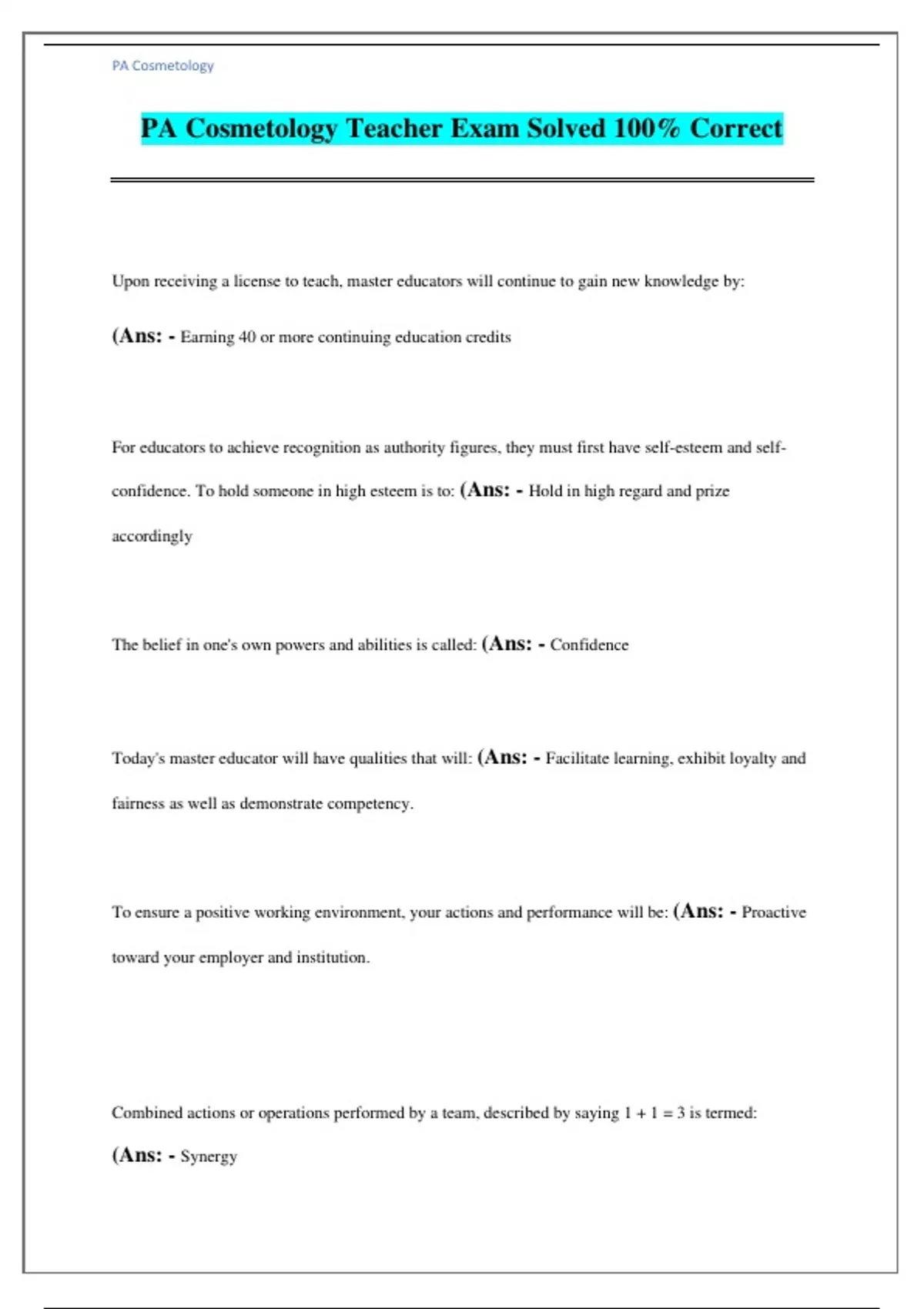PA Cosmetology Teacher Exam Solved 100% Correct Upon receiving a license to teach, master educators will continue to gain new knowledge by: (Ans: - Earning 40 or more continuing education credits For educators to achieve recognition as authority figures, they must first have self-esteem and self-confidence. To hold someone in high esteem is to: (Ans: - Hold in high regard and prize accordingly