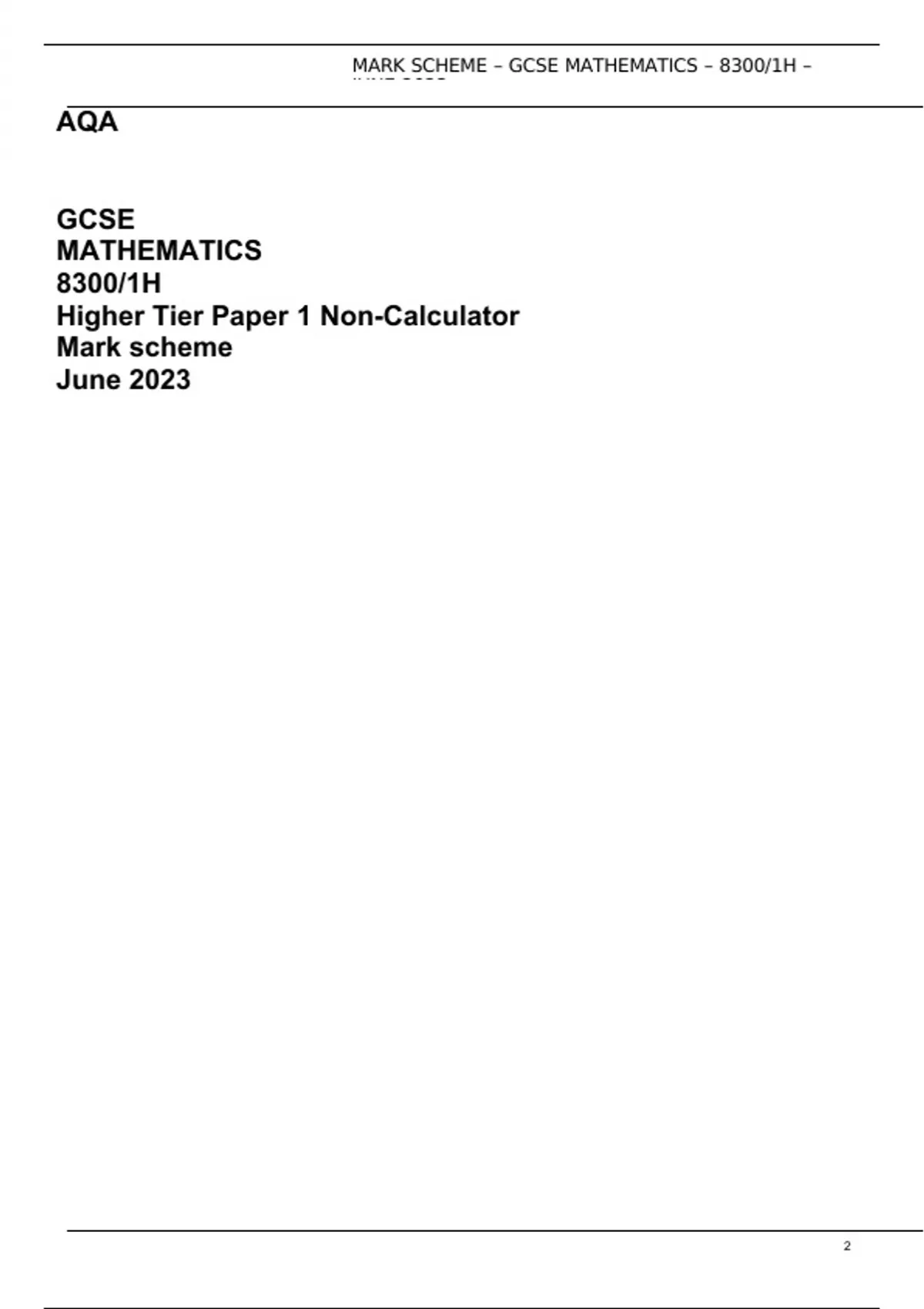 AQA GCSE MATHEMATICS 8300/1H Higher Tier Paper 1 Non-Calculator Mark scheme June 2023