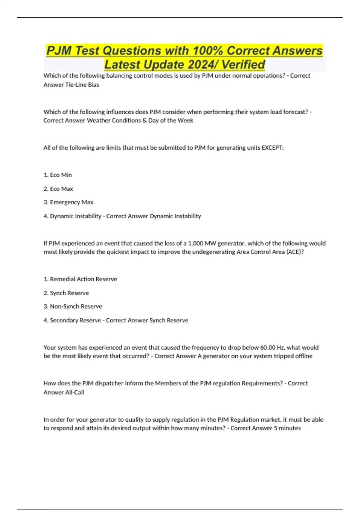 PJM Test Questions with 100% Correct Answers Latest Update 2024/ Verified Which of the following balancing control modes is used by PJM under normal operations? - Correct Answer Tie-Line Bias Which of the following influences does PJM consider when performing their system load forecast? - Correct Answer Weather Conditions & Day of the Week All of the following are limits that must be submitted to PJM for generating units EXCEPT: 1. Eco Min 2. Eco Max 3. Emergency Max 4. Dynamic Instability - Correct Answer Dynamic Instability If PJM experienced an event that caused the loss of a 1,000 MW generator, which of the following would most likely provide the quickest impact to improve the undegenerating Area Control Area (ACE)? 1. Remedial Action Reserve 2. Synch Reserve 3. Non-Synch Reserve 4. Secondary Reserve - Correct Answer Synch Reserve Your system has experienced an event that caused the frequency to drop below 60.00 Hz, what would be the most likely event that occurred? - Correct Answer A generator on your system tripped offline How does the PJM dispatcher inform the Members of the PJM regulation Requirements? - Correct Answer All-Call In order for your generator to quality to supply regulation in the PJM Regulation market, it must be able to respond and attain its desired output within how many minutes