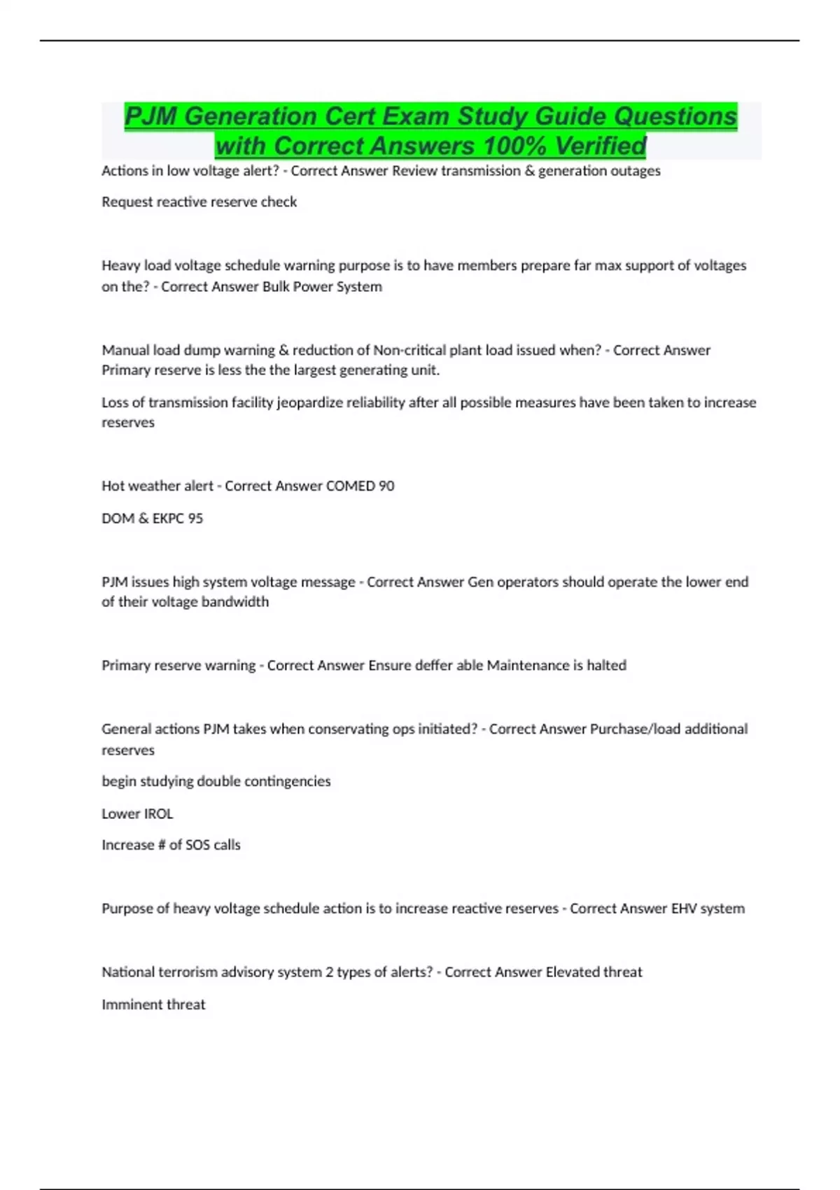 PJM Generation Cert Exam Study Guide Questions with Correct Answers 100% Verified Actions in low voltage alert? - Correct Answer Review transmission & generation outages Request reactive reserve check Heavy load voltage schedule warning purpose is to have members prepare far max support of voltages on the? - Correct Answer Bulk Power System Manual load dump warning & reduction of Non-critical plant load issued when? - Correct Answer Primary reserve is less the the largest generating unit. Loss of transmission facility jeopardize reliability after all possible measures have been taken to increase reserves Hot weather alert - Correct Answer COMED 90 DOM & EKPC 95 PJM issues high system voltage message - Correct Answer Gen operators should operate the lower end of their voltage bandwidth Primary reserve warning - Correct Answer Ensure deffer able Maintenance is halted General actions PJM takes when conservating ops initiated? - Correct Answer Purchase/load additional reserves begin studying double contingencies Lower IROL Increase # of SOS calls Purpose of heavy voltage schedule action is to increase reactive reserves - Correct Answer EHV system National terrorism advisory system 2 types of alerts? - Correct Answer Elevated threat Imminent threat