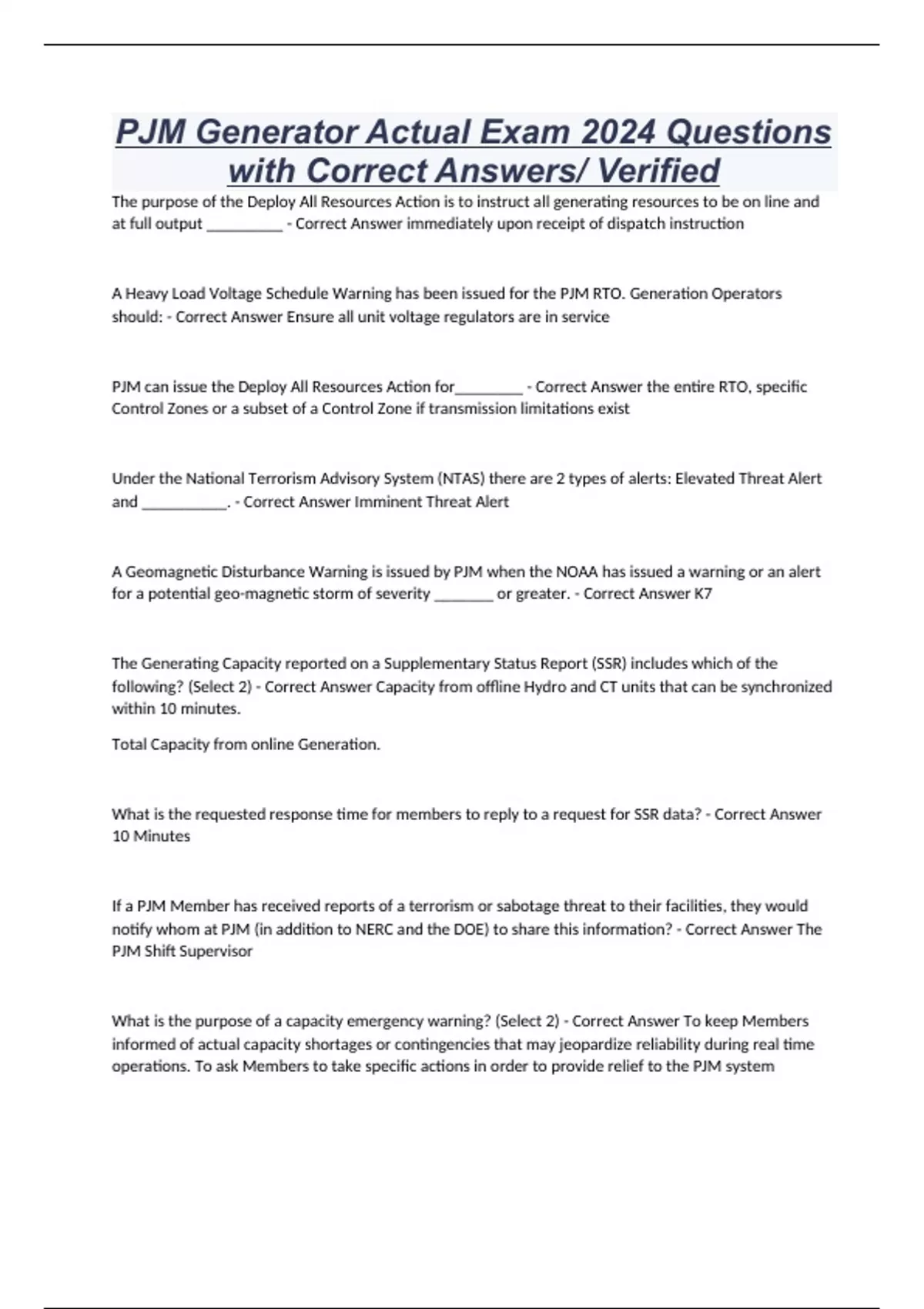PJM Generator Actual Exam 2024 Questions with Correct Answers/ Verified