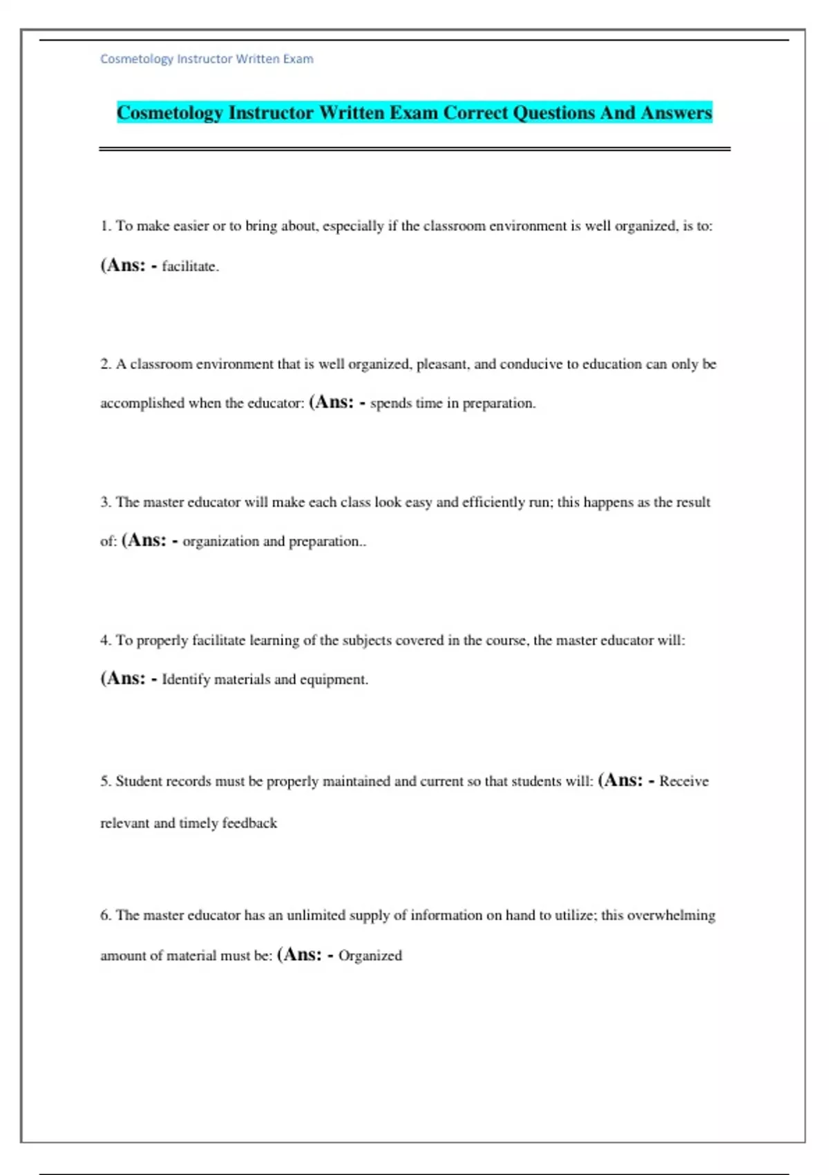 Cosmetology Instructor Written Exam Correct Questions And Answers 1. To make easier or to bring about, especially if the classroom environment is well organized, is to: (Ans: - facilitate. 2. A classroom environment that is well organized, pleasant, and conducive to education can only be accomplished when the educator: (Ans: - spends time in preparation.