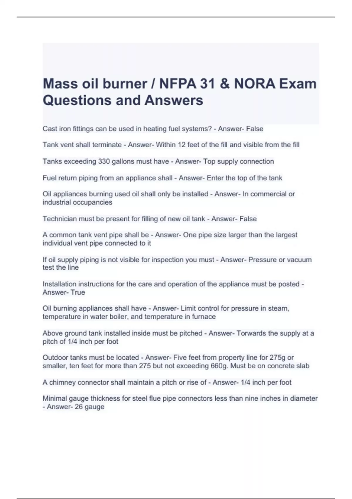 Mass oil burner -NFPA 31 & NORA Exam Questions and Answers