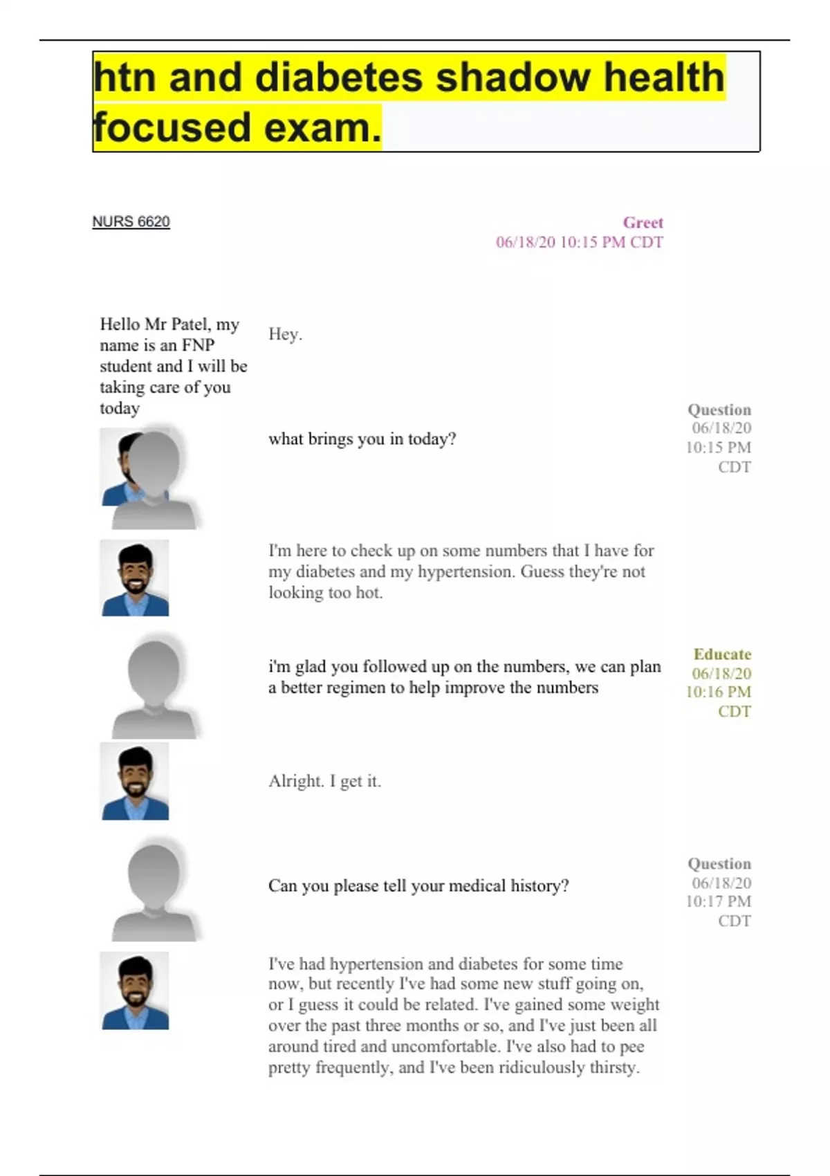 NURS 6620 Hello Mr Patel, my name is an FNP student and I will be taking care of you today Hey. what brings you in today? Greet 06/18/20 10:15 PM CDT Question 06/18/20 10:15 PM CDT I'm here to check up on some numbers that I have for my diabetes and my hypertension. Guess they're not looking too hot. i'm glad you followed up on the numbers, we can plan a better regimen to help improve the numbers Alright. I get it. Can you please tell your medical history? I've had hypertension and diabetes for some time now, but recently I've had some new stuff going on, or I guess it could be related. I've gained some weight over the past three months or so, and I've just been all around tired and uncomfortable. I've also had to pee pretty frequently, and I've been ridiculously thirsty. Educate 06/18/20 10:16 PM CDT Question 06/18/20 10:17 PM CDT I am sorry to hear that, that must have been challenf=ging Well, gee. Thanks. your symptoms are related to diabetes and hypertension I don't have any allergies that I know of. Any other symptom apart from the ones you mentioned? I've had hypertension and diabetes for some time now, but recently I've had some new stuff going on, or I guess it could be related. I've gained some weight over the past three months or so, and I've just been all around tired and uncomfortable. I've also had to pee pretty frequently, and I've been ridiculously thirsty. Do you have any pain? I'm not in any pain. [AUDIO COMING SOON] Empathize 06/18/20 10:19 PM CDT Question 06/18/20 10:20 PM CDT Question 06/18/20 10:22 PM CDT Question 06/18/20 10:22 PM CDT Any recent hospitalizations? I haven't ever been hospitalized in that sense of the word. But I have seen a doctor before, about my hypertension and diabetes numbers, and I'm here to check in about them. What medication are you taking? Hydrochlorothiazide for my hypertension, metformin for diabetes, and escitalopram for anxiety. Do you take any other non prescription medication? (Clarified to Are there other prescriptions you are taking that we haven't discussed?.) Nothing besides hydrochlorothiazide, metformin, and escitalopram. (Clarified to if I am taking other prescriptions.) How often do you take your medications I take all my meds every day . . . the metformin is three times a day, and the water one and the anxiety one are both once a day. Question 06/18/20 10:23 PM CDT Question 06/18/20 10:23 PM CDT Question 06/18/20 10:25 PM CDT Question 06/18/20 10:25 PM CDT Do you have any reaction from tis meds (No matching questions found.) Do you have any reaction from taking these medications I don't have any allergies to anything. when were you diagnosed with diabetes? I was diagnosed with type two diabetes about five years ago. That was a great day. When were you diagnosed with hypertension? I was diagnosed with high blood pressure a year ago. When was the last time you visited the doctor? Question 06/18/20 10:26 PM CDT Question 06/18/20 10:27 PM CDT Question 06/18/20 10:29 PM CDT Question 06/18/20 10:29 PM CDT Question 06/18/20 10:30 PM CDT My last checkup was about 6 months ago. I was supposed to come in sooner, but I've been so busy that I just forgot. A week ago I had some labs done to prepare for this visit. [AUDIO COMING SOON] Do you smoke? I don't use any tobacco. Do you use any illegal drugs? I smoked pot a little bit in undergrad, but it's been years. do you drink alcohol? I never drink. Tell me you your family past medical history? (Clarified to Can you tell me about your family medical history?.) Question 06/18/20 10:31 PM CDT Question 06/18/20 10:31 PM CDT Question 06/18/20 10:31 PM CDT Question 06/18/20 10:32 PM CDT My folks have some stuff going on, which is probably why I've got some stuff going on. My dad has hypertension like me, and my mom has diabetes like me. She has high cholesterol, too. (Clarified to to tell you about my family medical history.) That's good to know, we probably need to check your cholesterol levels to make sure it is within normal limit I hadn't thought of that. Do you live alone or with your family? Miranda and I just moved in together. Who is Miranda if I may Ask? My girlfriend! You'll meet her at some point, I'm sure. [AUDIO COMING SOON] I would love to meet her (No matching questions found.) Educate 06/18/20 10:33 PM CDT Question 06/18/20 10:33 PM CDT Question 06/18/20 10:34 PM CDT Question 06/18/20 10:35 PM CDT