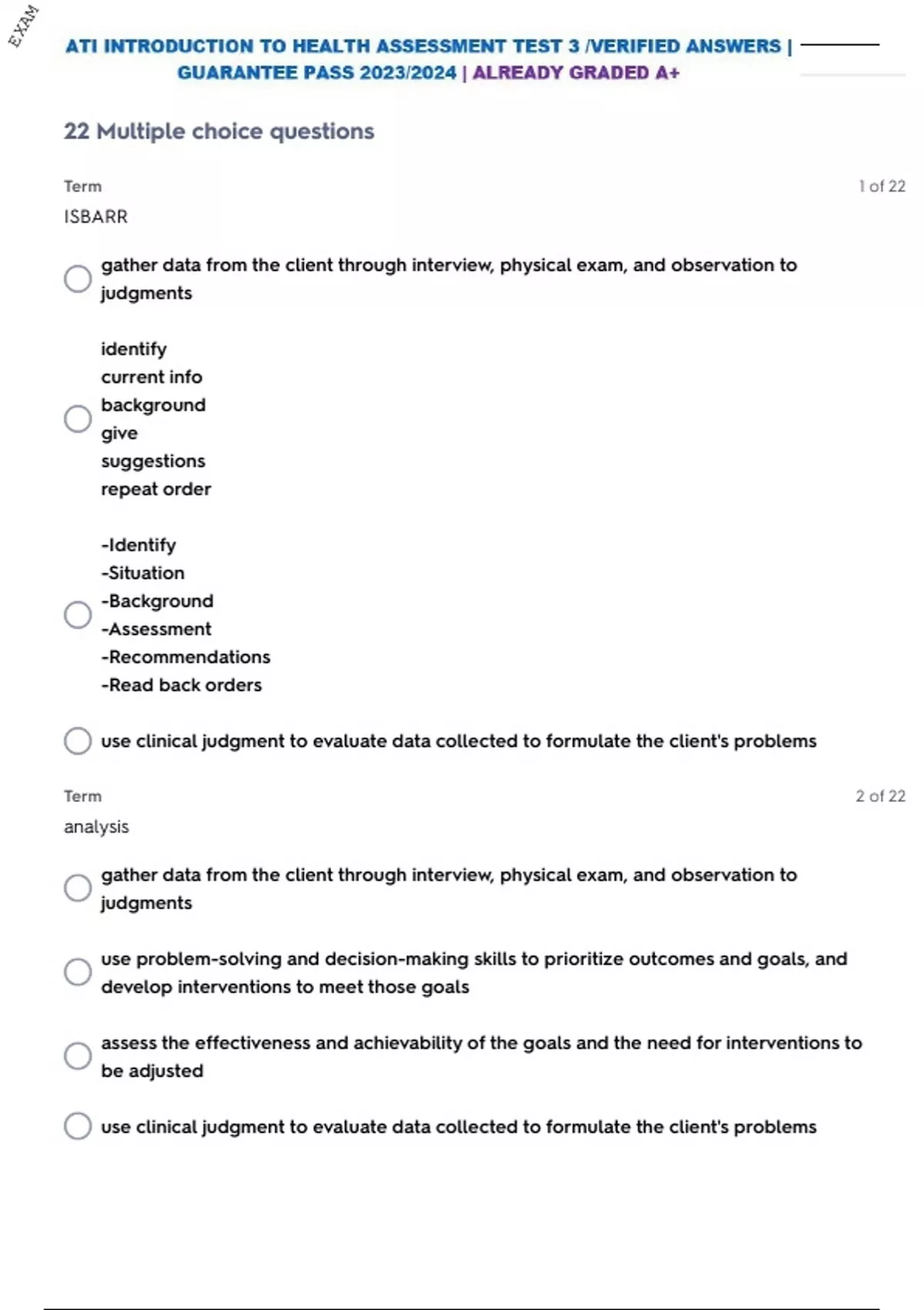 ATI INTRODUCTION TO HEALTH ASSESSMENT TEST QUESTIONS WITH 100% CORRECT ANSWERS