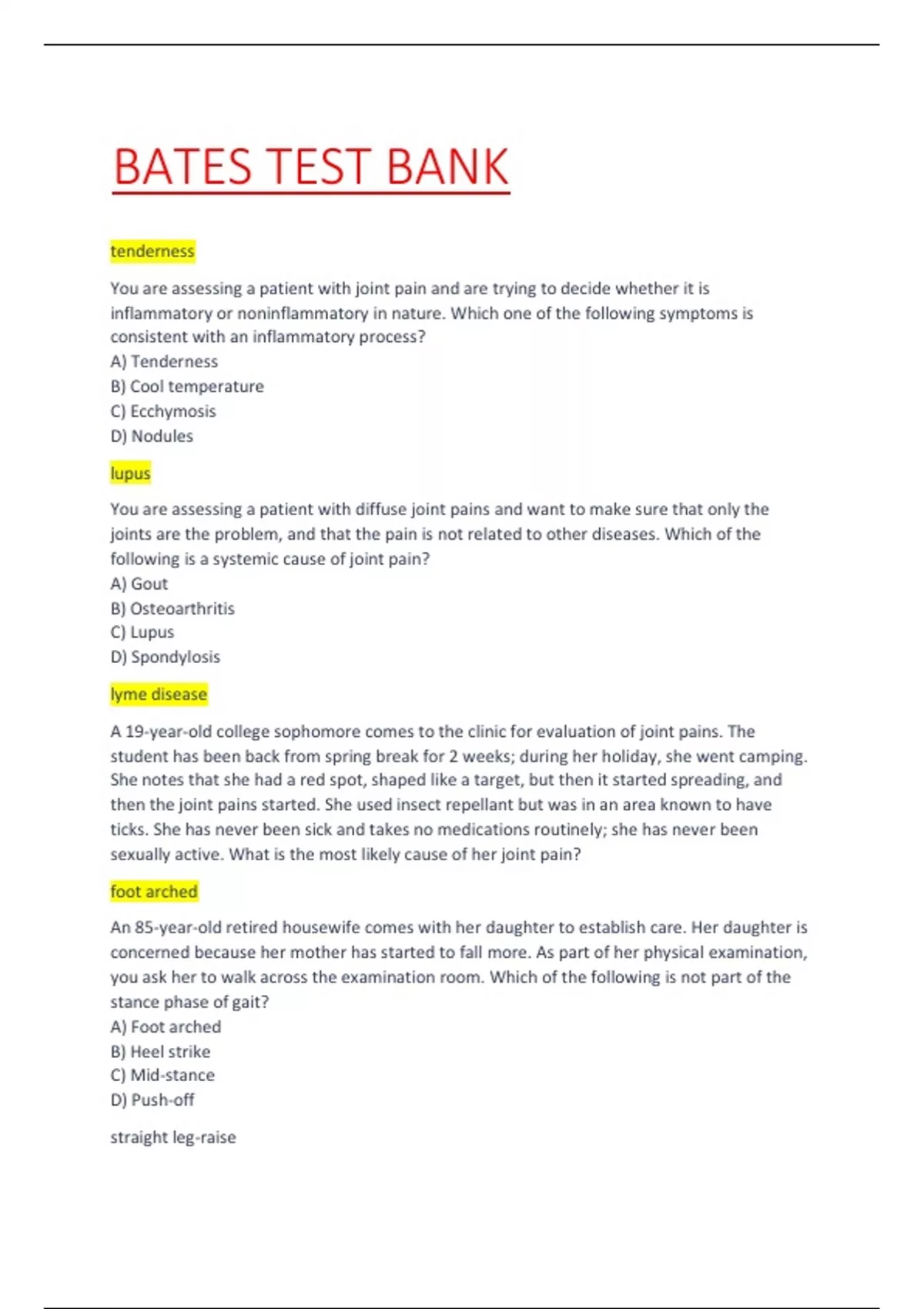 You are assessing a patient with diffuse joint pains and want to make sure that only the joints are the problem, and that the pain is not related to other diseases. Which of the following is a systemic cause of joint pain? A) Gout B) Osteoarthritis C) Lupus D) Spondylosis lyme disease A 19-year-old college sophomore comes to the clinic for evaluation of joint pains. The student has been back from spring break for 2 weeks; during her holiday, she went camping. She notes that she had a red spot, shaped like a target, but then it started spreading, and then the joint pains started. She used insect repellant but was in an area known to have ticks. She has never been sick and takes no medications routinely; she has never been sexually active. What is the most likely cause of her joint pain? foot arched An 85-year-old retired housewife comes with her daughter to establish care. Her daughter is concerned because her mother has started to fall more. As part of her physical examination, you ask her to walk across the examination room. Which of the following is not part of the stance phase of gait? A) Foot arched B) Heel strike C) Mid-stance D) Push-off straight leg-raise