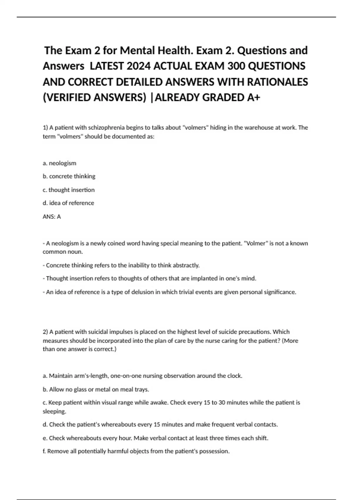 The Exam 2 for Mental Health. Exam 2. Questions and Answers LATEST 2024 ACTUAL EXAM 300 QUESTIONS AND CORRECT DETAILED ANSWERS WITH RATIONALES (VERIFIED ANSWERS) |ALREADY GRADED A+ 1) A patient with schizophrenia begins to talks about "volmers" hiding in the warehouse at work. The term "volmers" should be documented as: a. neologism b. concrete thinking c. thought insertion d. idea of reference ANS: A - A neologism is a newly coined word having special meaning to the patient. "Volmer" is not a known common noun. - Concrete thinking refers to the inability to think abstractly. - Thought insertion refers to thoughts of others that are implanted in one's mind. - An idea of reference is a type of delusion in which trivial events are given personal significance. 2) A patient with suicidal impulses is placed on the highest level of suicide precautions. Which measures should be incorporated into the plan of care by the nurse caring for the patient? (More than one answer is correct.) a. Maintain arm's-length, one-on-one nursing observation around the clock. b. Allow no glass or metal on meal trays. c. Keep patient within visual range while awake. Check every 15 to 30 minutes while the patient is sleeping. d. Check the patient's whereabouts every 15 minutes and make frequent verbal contacts. e. Check whereabouts every hour. Make verbal contact at least three times each shift. f. Remove all potentially harmful objects from the patient's possession. ANS: A, B, F One-on-one observation is necessary for anyone who has limited control over suicidal impulses. - Plastic dishes on trays and the removal of potentially harmful objects from the patient's possession are measures included in any-level suicide precautions. The remaining options are used in less stringent levels of suicide precautions. Brainpower Read More 3) A patient diagnosed with schizophrenia anxiously says, "I can see the left side of my body merging with the wall, then my face appears and disappears in the mirror." While listening, the nurse should: a. sit close to the patient. b. place an arm protectively around the patient's shoulders. c. place a hand on the patient's arm and exert light pressure. d. maintain a normal social interaction distance from the patient. ANS: D The patient is describing phenomena that indicate personal boundary difficulties. The nurse should maintain an appropriate social distance and not touch the patient, because the patient is anxious about the inability to maintain ego boundaries and merging with or being swallowed by the environment. Physical closeness or touch could precipitate panic. 4) Which statement indicates a patient with major depression is most likely outlook on life during the acute phase of the illness? During an acute phase of major depression, the client may feel worthless and deserve bad things to happen personally. 5) A patient diagnosed with bipolar disorder is in the maintenance phase of treatment. The patient asks, "Do I have to keep taking this lithium even though my mood is stable now?" Select the nurse's appropriate response. a. "You will be able to stop the medication in about 1 month." b. "Taking the medication every day helps reduce the risk of a relapse." c. "Usually patients take medication for approximately 6 months after discharge." d. "It's unusual that the health care provider hasn't already stopped your medication." ANS: B