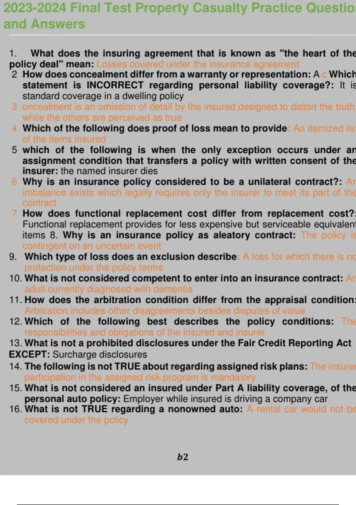 What does the insuring agreement that is known as "the heart of the policy deal" mean: Losses covered under the insurance agreement 2 How does concealment differ from a warranty or representation: A c Which statement is INCORRECT regarding personal liability coverage?: It is standard coverage in a dwelling policy 3 oncealment is an omission of detail by the insured designed to distort the truth, while the others are perceived as true 4 Which of the following does proof of loss mean to provide: An itemized list of the items insured 5 which of the following is when the only exception occurs under an assignment condition that transfers a policy with written consent of the insurer: the named insurer dies