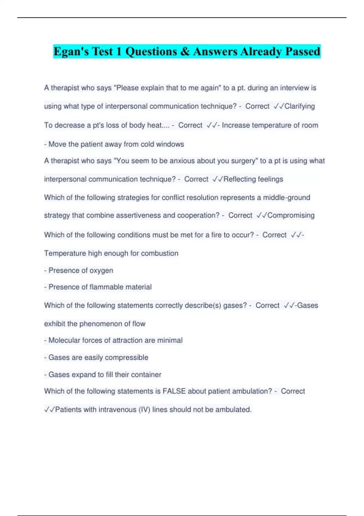 Egan's Test 1 Questions & Answers Already Passed
