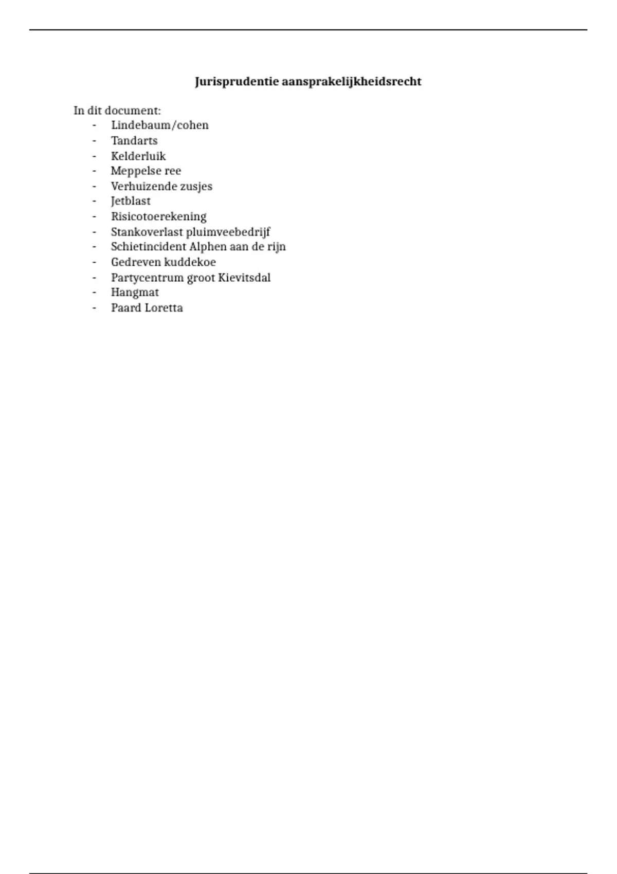 De rechtsregel van alle arresten van het vak aansprakelijkheidsrecht UvA met daarbij wat handig is om te arceren in het arrest. (bevat oa: tennet/ABB, de tienjarige Lard, staatsloterij/loterijverlies, Achmea/menzis, des-dochters)