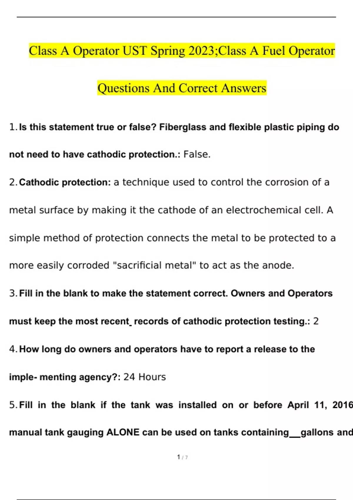 Class A Operator UST Spring 2023; Class A Fuel Operator complete test