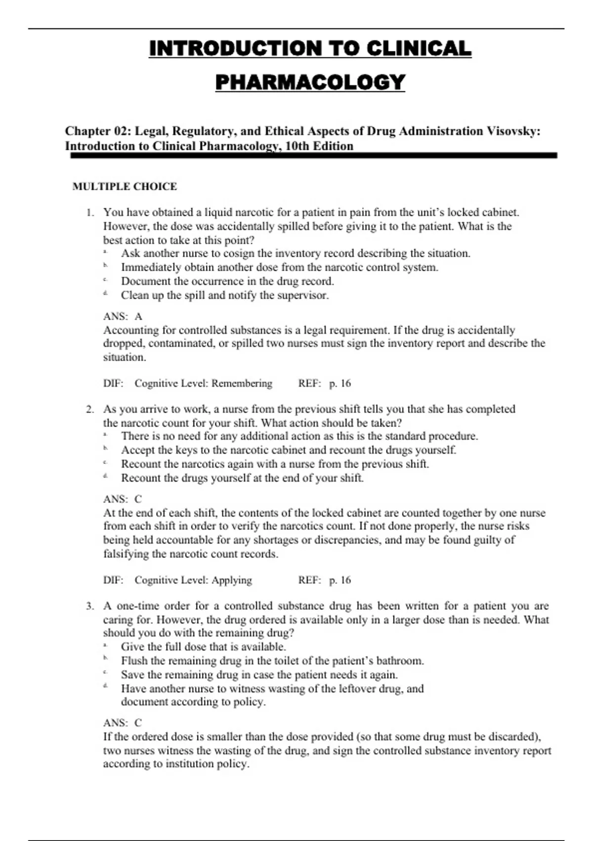 1. You have obtained a liquid narcotic for a patient in pain from the unit’s locked cabinet. However, the dose was accidentally spilled before giving it to the patient. What is the best action to take at this point? a. Ask another nurse to cosign the inventory record describing the situation. b. Immediately obtain another dose from the narcotic control system. c. Document the occurrence in the drug record. d. Clean up the spill and notify the supervisor. ANS: A Accounting for controlled substances is a legal requirement. If the drug is accidentally dropped, contaminated, or spilled two nurses must sign the inventory report and describe the situation. DIF: Cognitive Level: Remembering REF: p. 16