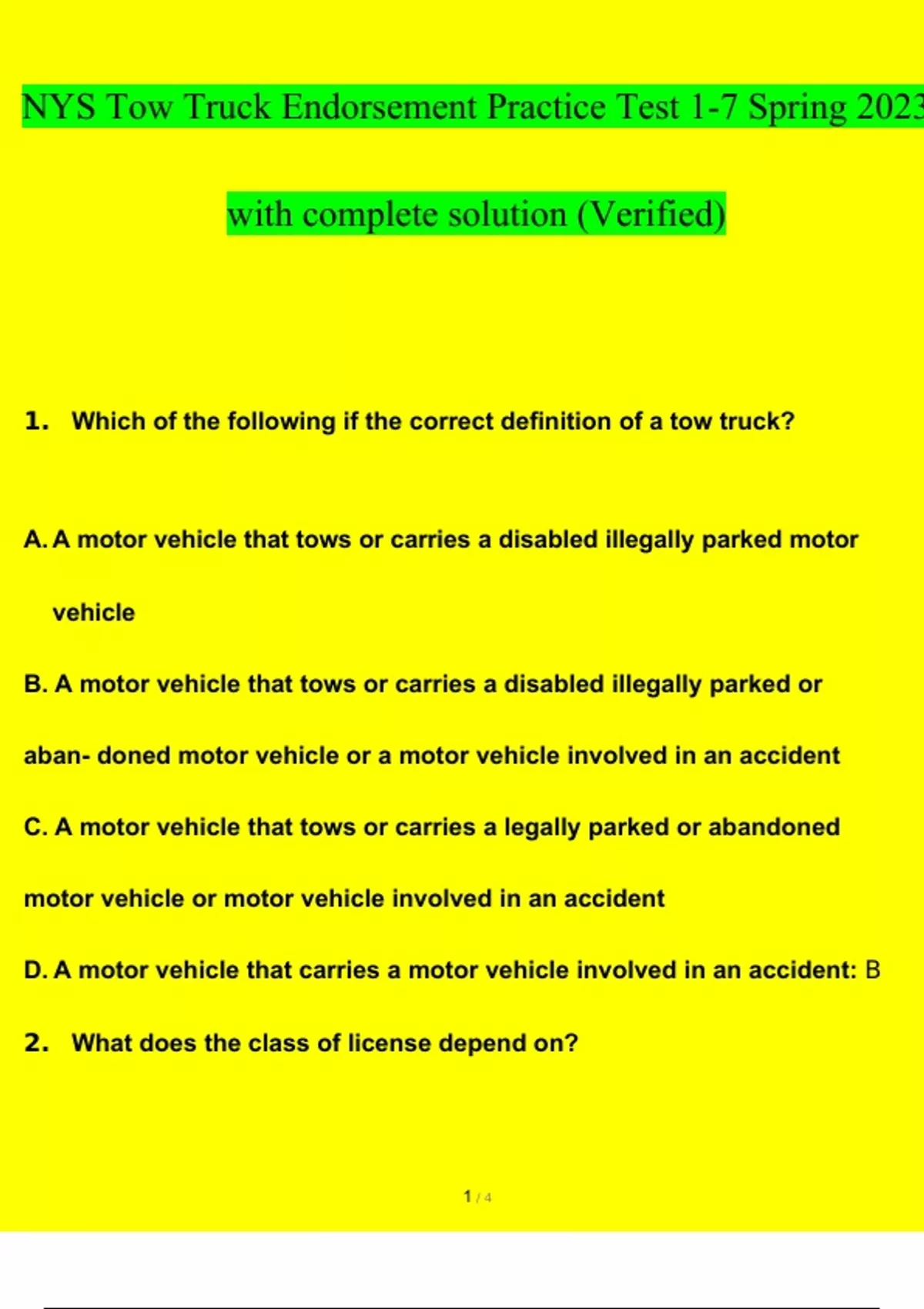 NYS Tow Truck Endorsement Practice Tests 1-7 Spring 2023 with complete solution 100% Verified