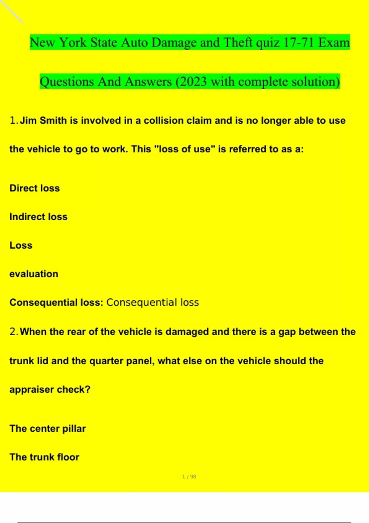 New York State Auto Damage and Theft quiz 17-71 Exam 2023 with complete solution