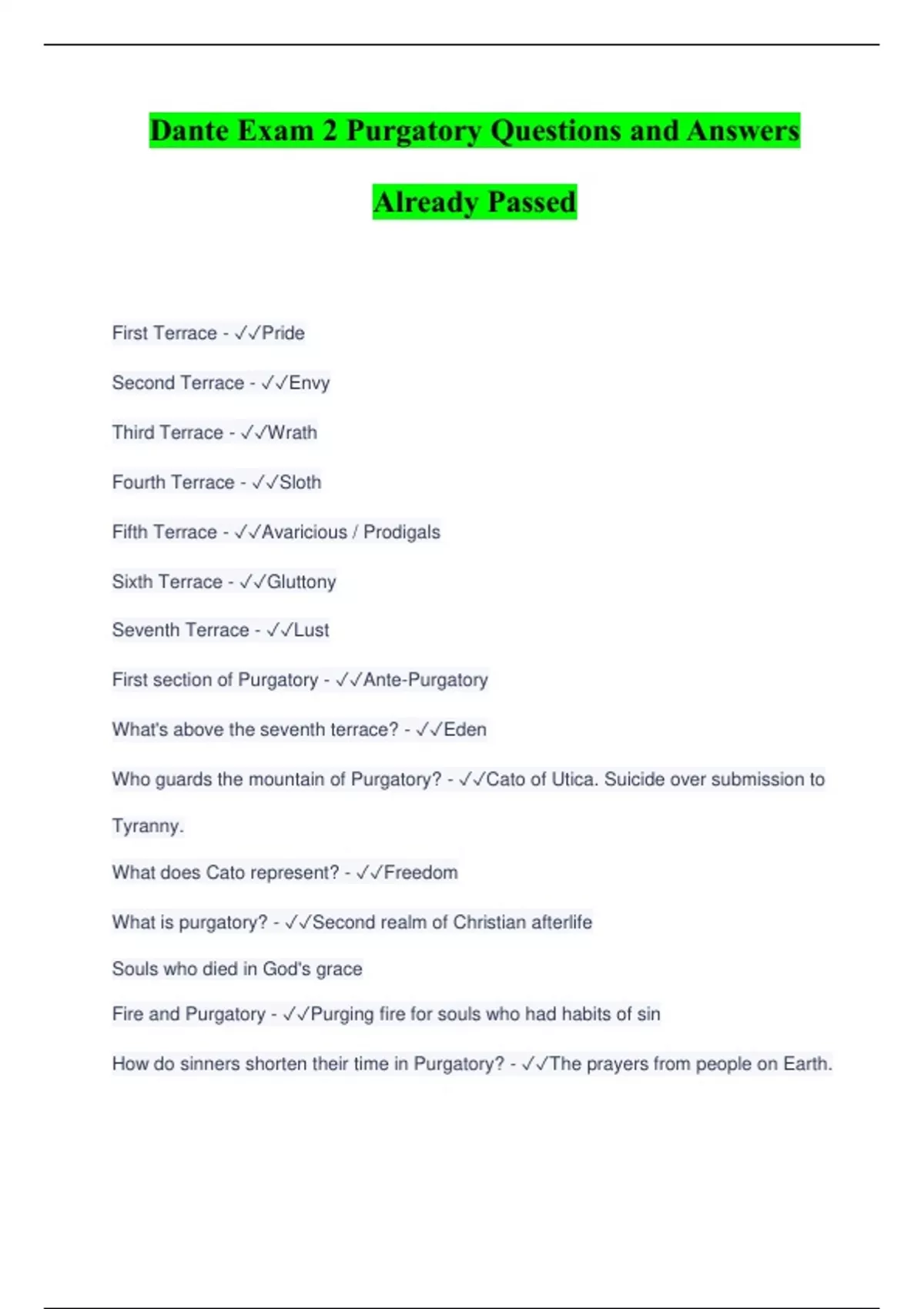 Dante Exam 2 Purgatory Questions and Answers Already Passed