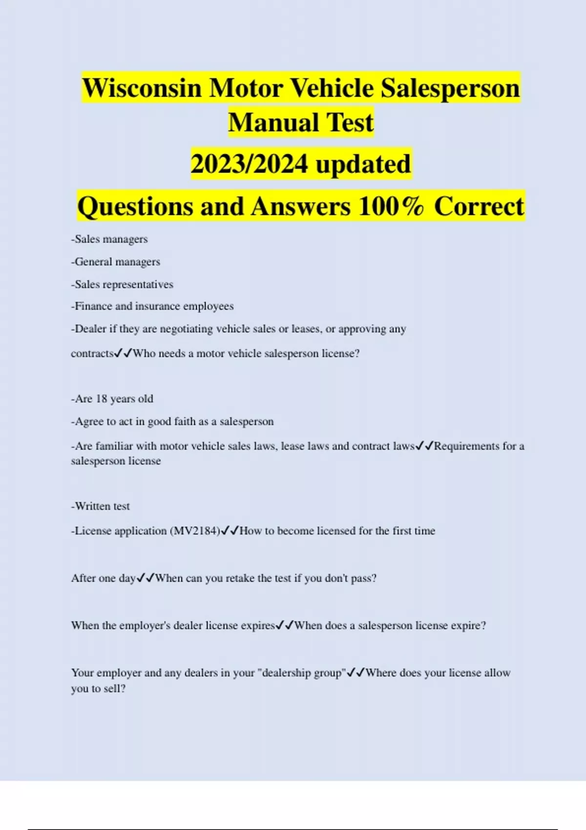 Wisconsin Motor Vehicle Salesperson Manual Test 2023/2024 updated Questions and Answers 100% Correct