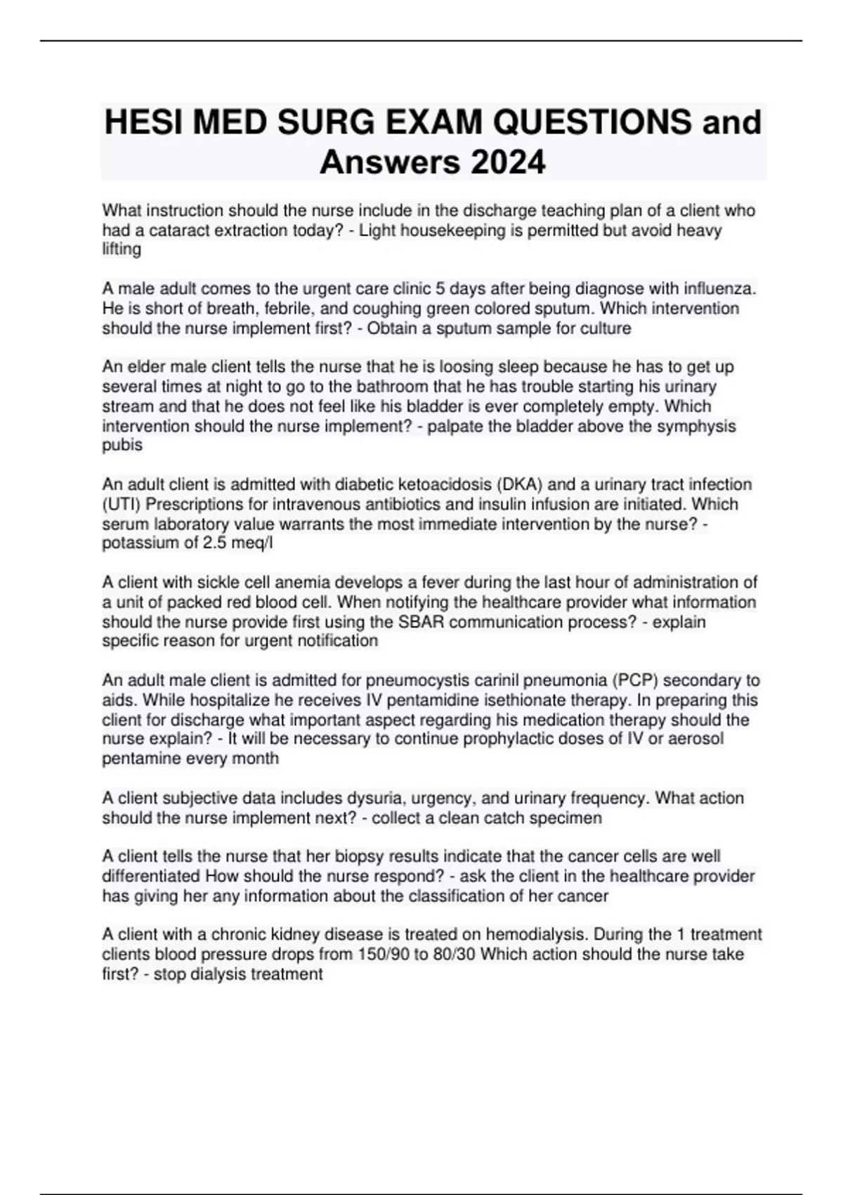 HESI MED SURG EXAM QUESTIONS and Answers 2024