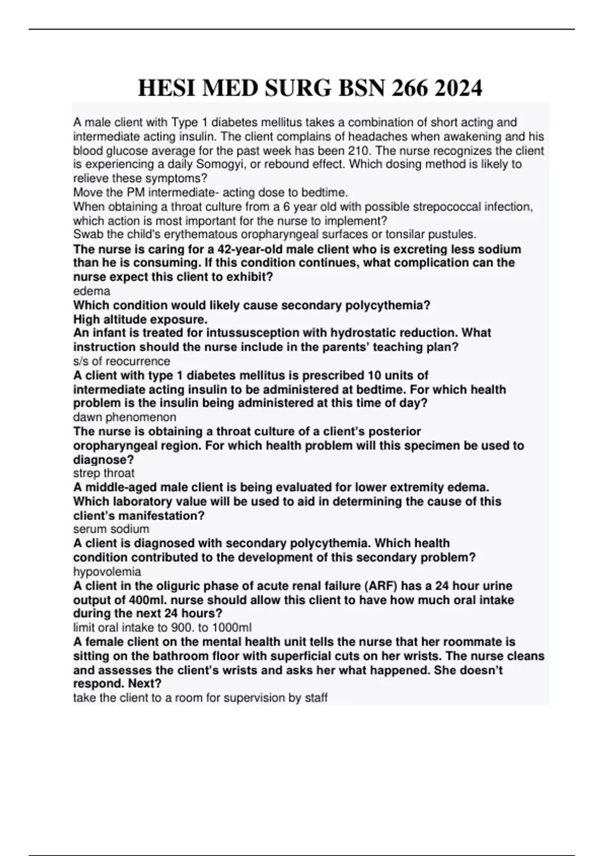 A male client with Type 1 diabetes mellitus takes a combination of short acting and intermediate acting insulin. The client complains of headaches when awakening and his blood glucose average for the past week has been 210. The nurse recognizes the client is experiencing a daily Somogyi, or rebound effect. Which dosing method is likely to relieve these symptoms? Move the PM intermediate- acting dose to bedtime. When obtaining a throat culture from a 6 year old with possible strepococcal infection, which action is most important for the nurse to implement? Swab the child's erythematous oropharyngeal surfaces or tonsilar pustules. The nurse is caring for a 42-year-old male client who is excreting less sodium than he is consuming. If this condition continues, what complication can the nurse expect this client to exhibit? edema Which condition would likely cause secondary polycythemia? High altitude exposure. An infant is treated for intussusception with hydrostatic reduction. What instruction should the nurse include in the parents’ teaching plan? s/s of reocurrence A client with type 1 diabetes mellitus is prescribed 10 units of intermediate acting insulin to be administered at bedtime. For which health problem is the insulin being administered at this time of day? dawn phenomenon The nurse is obtaining a throat culture of a client’s posterior oropharyngeal region. For which health problem will this specimen be used to diagnose? strep throat A middle-aged male client is being evaluated for lower extremity edema. Which laboratory value will be used to aid in determining the cause of this client’s manifestation? serum sodium A client is diagnosed with secondary polycythemia. Which health condition contributed to the development of this secondary problem? hypovolemia A client in the oliguric phase of acute renal failure (ARF) has a 24 hour urine output of 400ml. nurse should allow this client to have how much oral intake during the next 24 hours? limit oral intake to 900. to 1000ml A female client on the mental health unit tells the nurse that her roommate is sitting on the bathroom floor with superficial cuts on her wrists. The nurse cleans and assesses the client’s wrists and asks her what happened. She doesn’t respond. Next? take the client to a room for supervision by staff What assessment technique should the nurse use to monitor a client for a common untoward effect of phenytoin (Dilantin)? inspection of the mouth The nurse is preparing to administer an IM dose of Vitamin B1 (thiamine) to a male client experiencing acute alcohol withdrawal and peripheral neuritis. The client belligerently states, “what do you think you’re doing?” Response? "This shot will help relieve the pain in your feet When administering an intramuscular injection containing 3 ml of a painful medication, Intervention? select a large, deep muscle mass Locate the optic disk the really light area on the right When completing a mental health assessment, the nurse wishes to obtain information about a client’s insight and judgment. Which interview technique is most useful in assessing these mental abilities have the client describe what should be done if a child was observed alone in a locked car on a hot day An adult Muslim client with ulcerative colitis was admitted to the post-surgical unit earlier today following a bowel resection with temporary colostomy. Which intervention is most important for the nurse to implement? assign a care provider of the same gender The parents of a 6-year-old recently diagnosed with Duchene muscular dystrophy tell the nurse that their child wants to continue attending swimming classes. How should the nurs