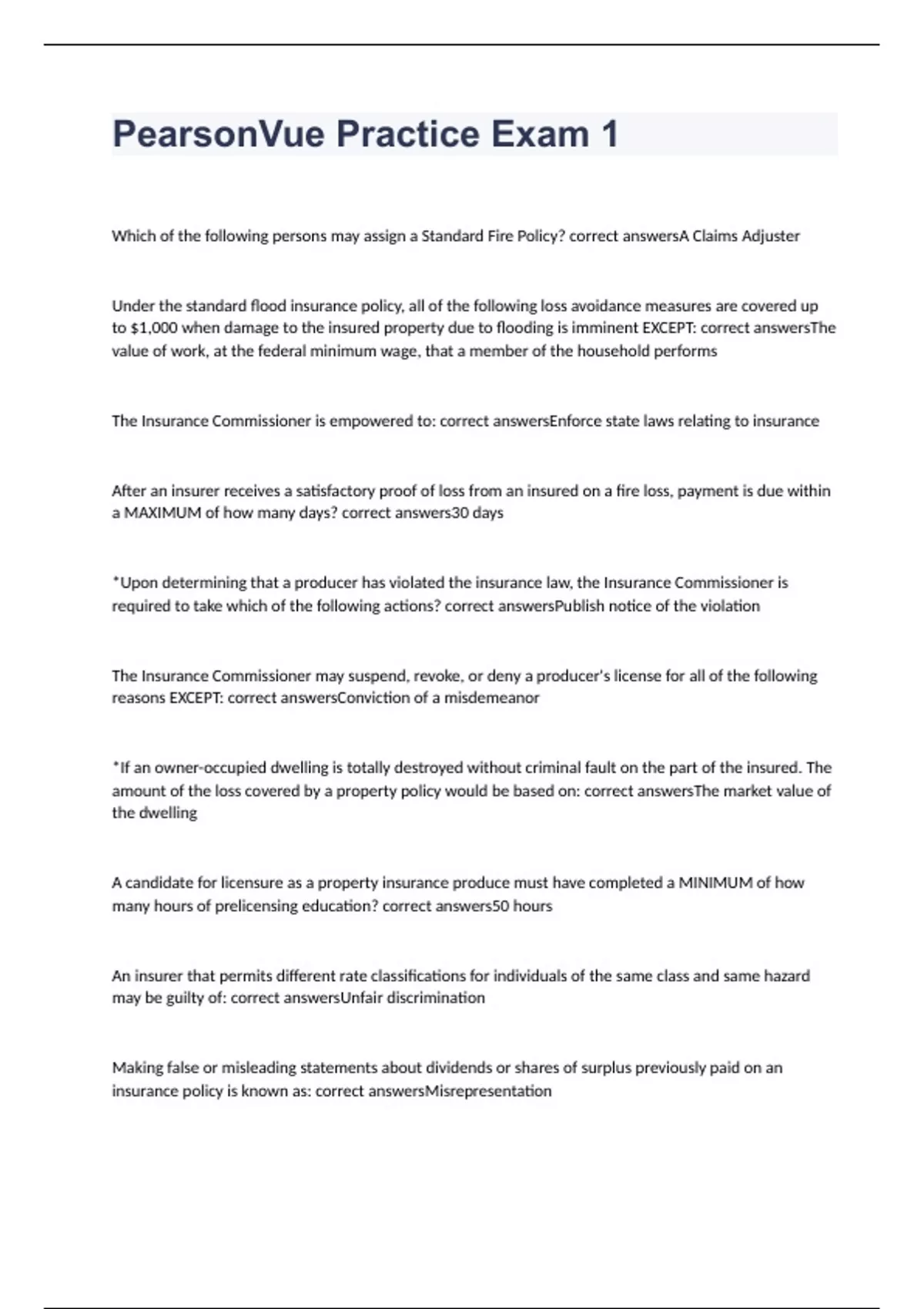 Which of the following persons may assign a Standard Fire Policy? correct answersA Claims Adjuster Under the standard flood insurance policy, all of the following loss avoidance measures are covered up to $1,000 when damage to the insured property due to flooding is imminent EXCEPT: correct answersThe value of work, at the federal minimum wage, that a member of the household performs The Insurance Commissioner is empowered to: correct answersEnforce state laws relating to insurance After an insurer receives a satisfactory proof of loss from an insured on a fire loss, payment is due within a MAXIMUM of how many days? correct answers30 days *Upon determining that a producer has violated the insurance law, the Insurance Commissioner is required to take which of the following actions? correct answersPublish notice of the violation The Insurance Commissioner may suspend, revoke, or deny a producer's license for all of the following reasons EXCEPT: correct answersConviction of a misdemeanor *If an owner-occupied dwelling is totally destroyed without criminal fault on the part of the insured. The amount of the loss covered by a property policy would be based on: correct answersThe market value of the dwelling A candidate for licensure as a property insurance produce must have completed a MINIMUM of how many hours of prelicensing education? correct answers50 hours An insurer that permits different rate classifications for individuals of the same class and same hazard may be guilty of: correct answersUnfair discrimination Making false or misleading statements about dividends or shares of surplus previously paid on an insurance policy is known as: correct answersMisrepresentation