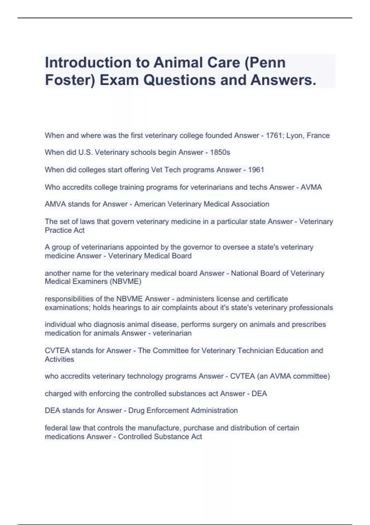 Introduction to Animal Care (Penn Foster) Exam Questions and Answers