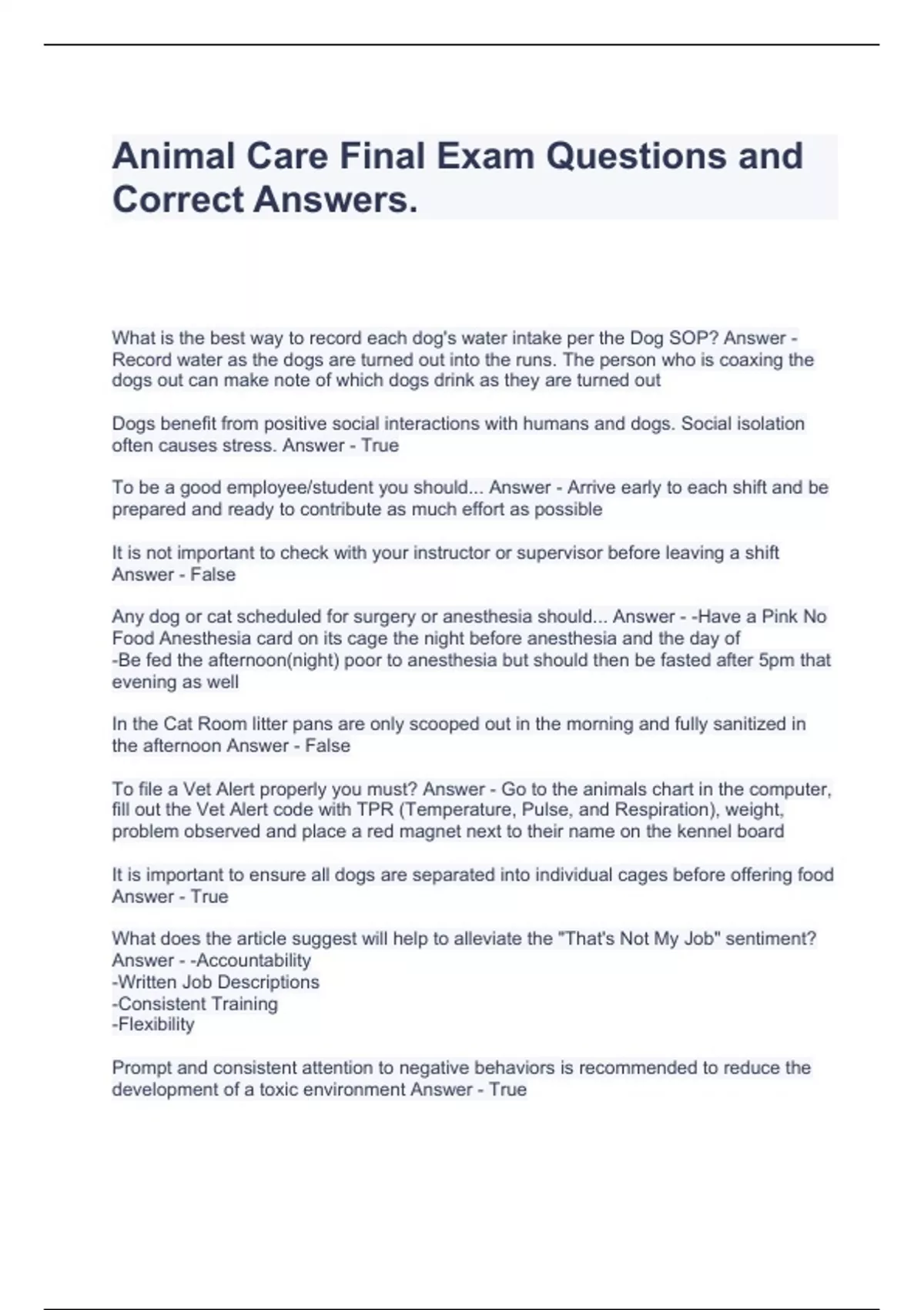 Animal Care Final Exam Questions and Correct Answers