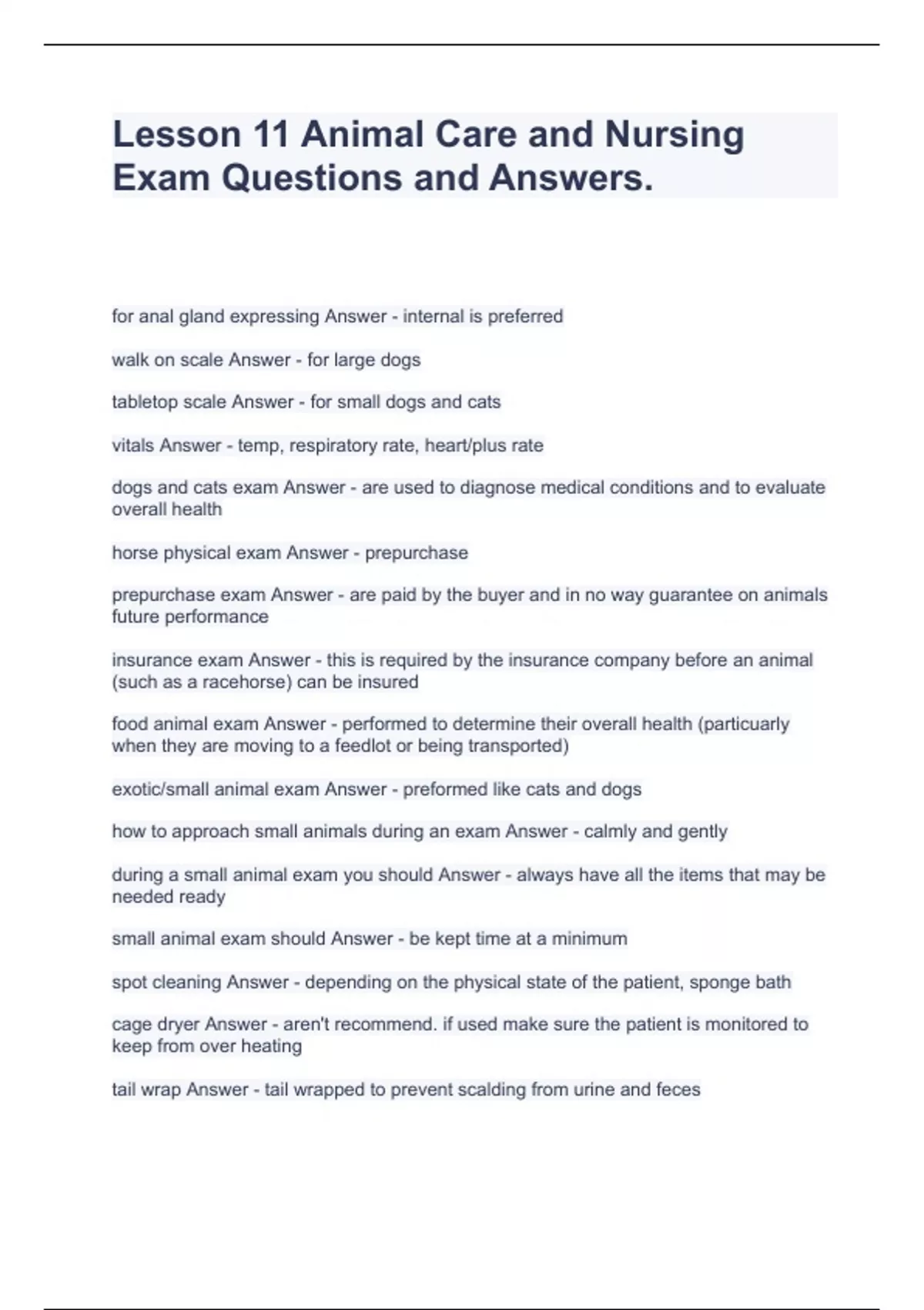 Lesson 11 Animal Care and Nursing Exam Questions and Answers