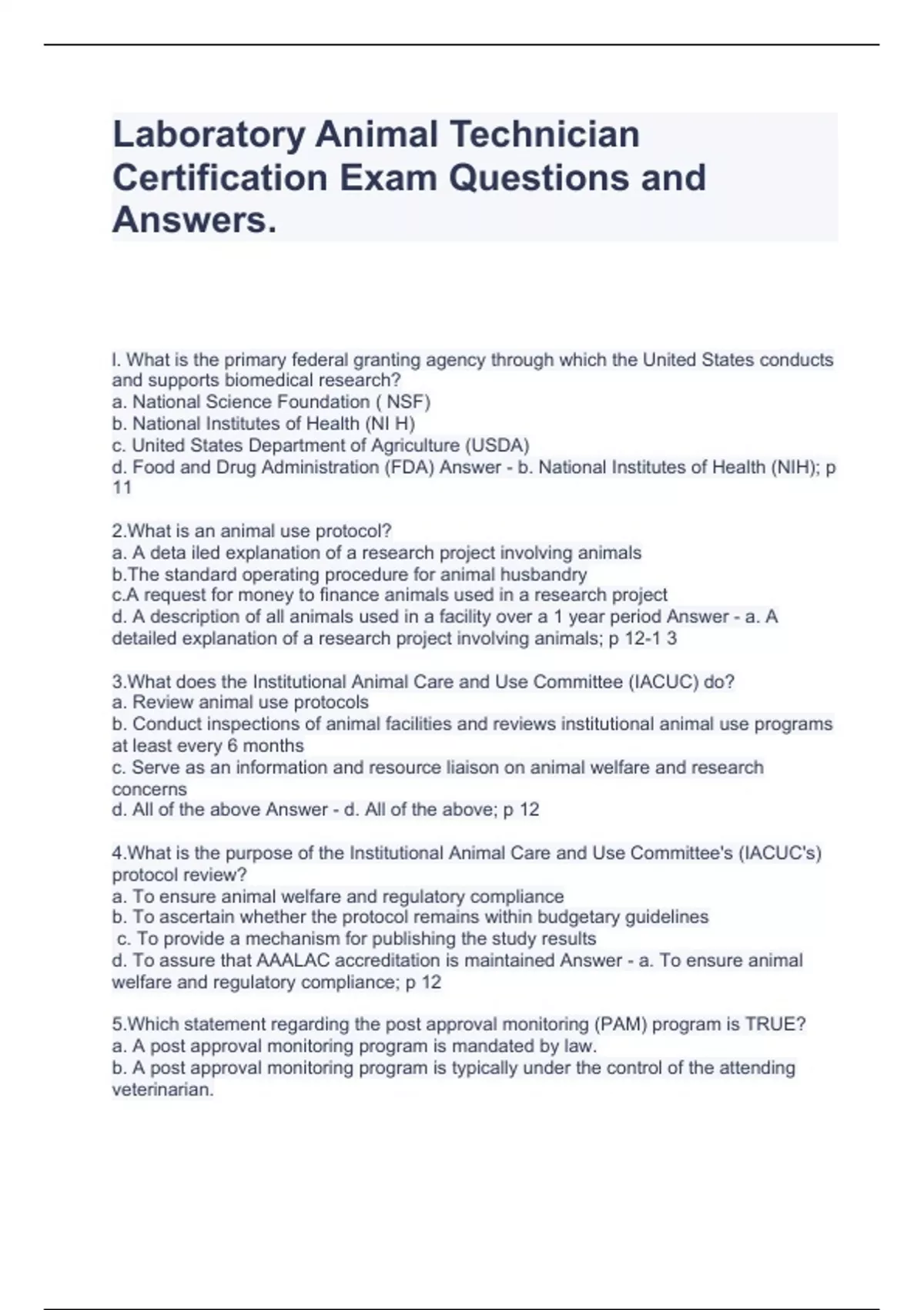 Laboratory Animal Technician Certification Exam Questions and Answers