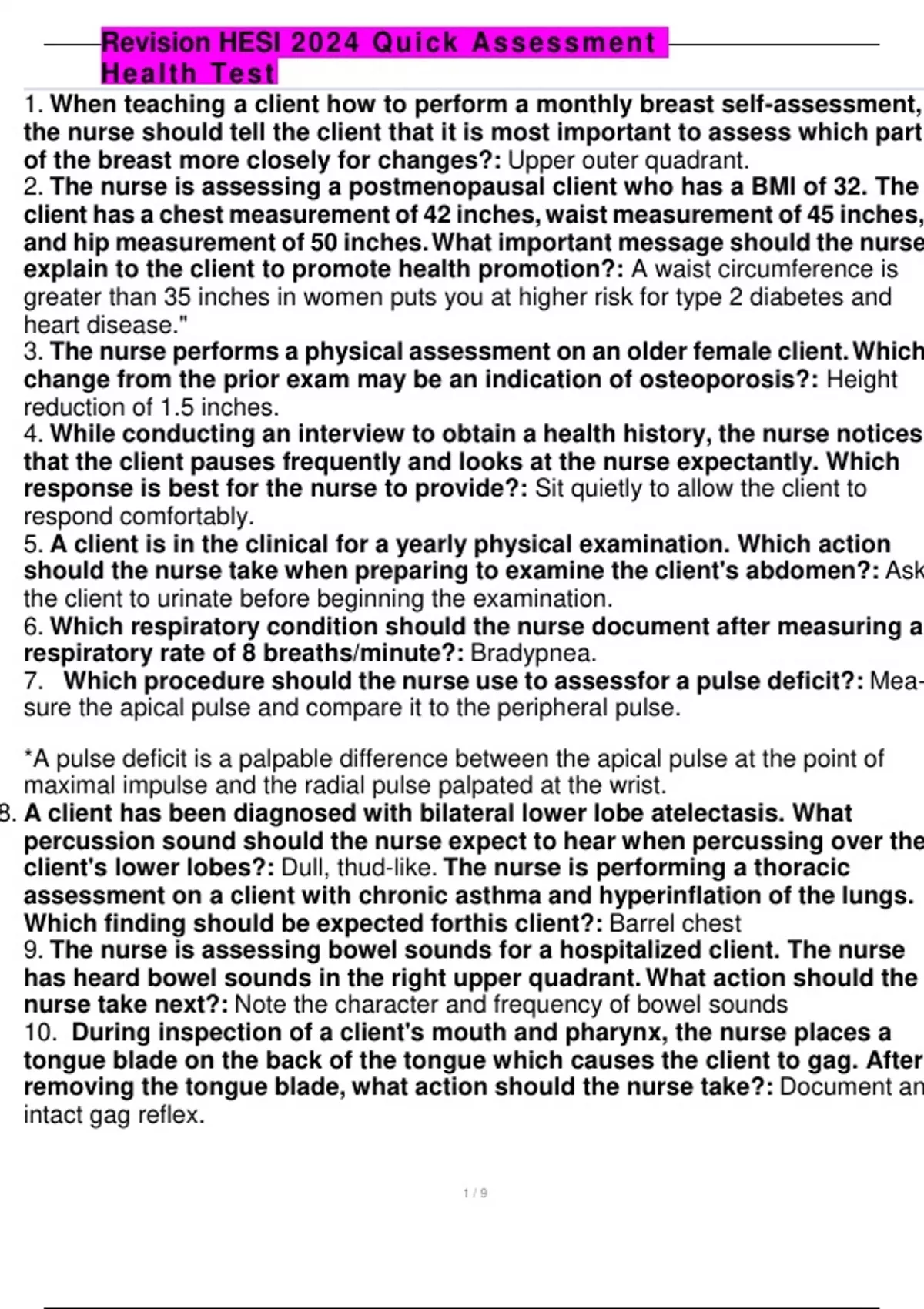 revision hesi 2024 quick assessment health test