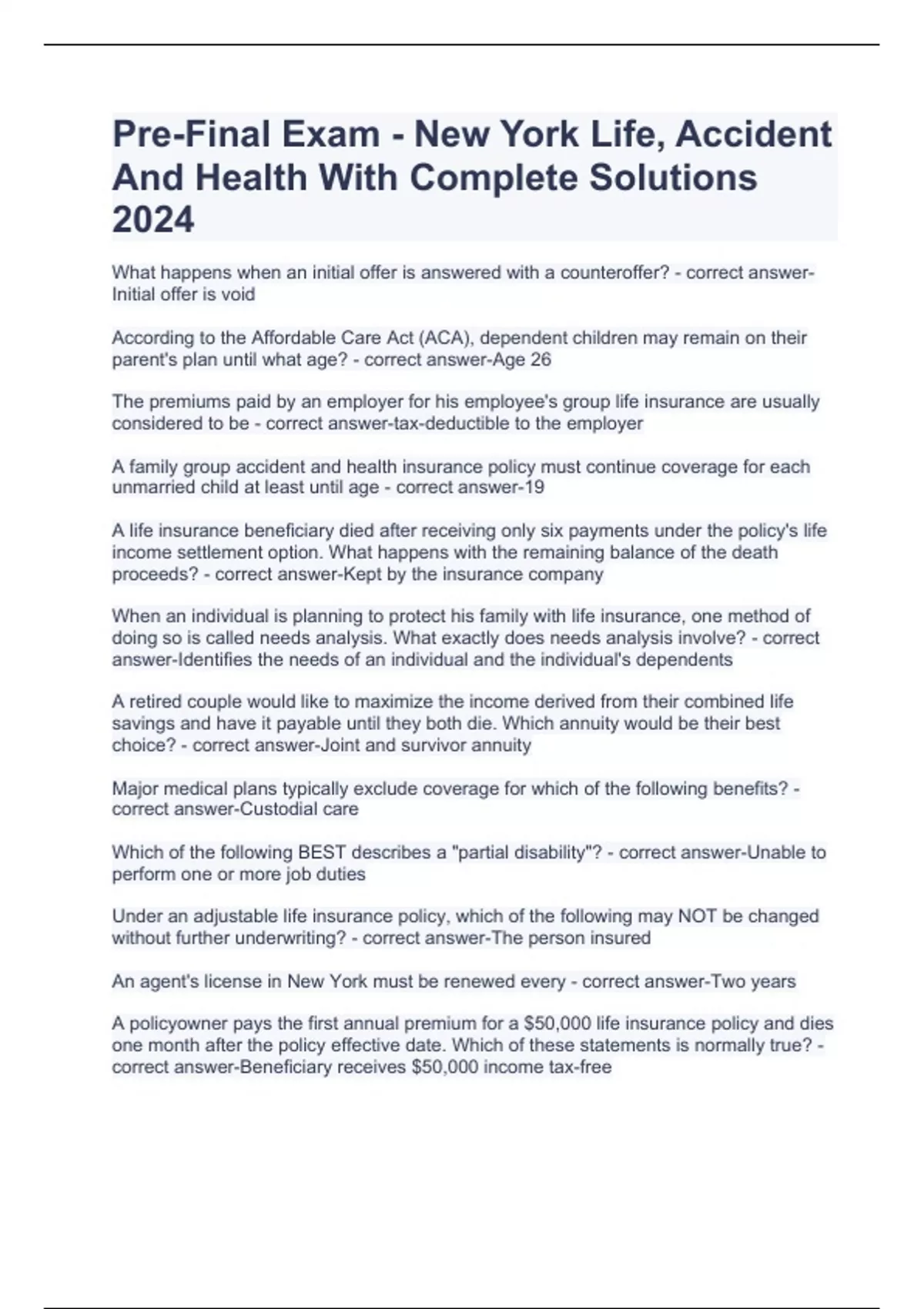 Pre-Final Exam - New York Life, Accident And Health With Complete Solutions 2024