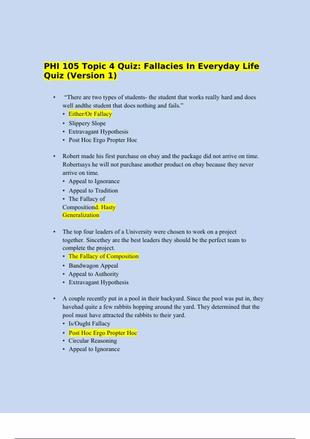 PHI 105 Topic 4 Quiz: Fallacies In Everyday Life Quiz (Latest Version 2024 ), Grand Canyon University.