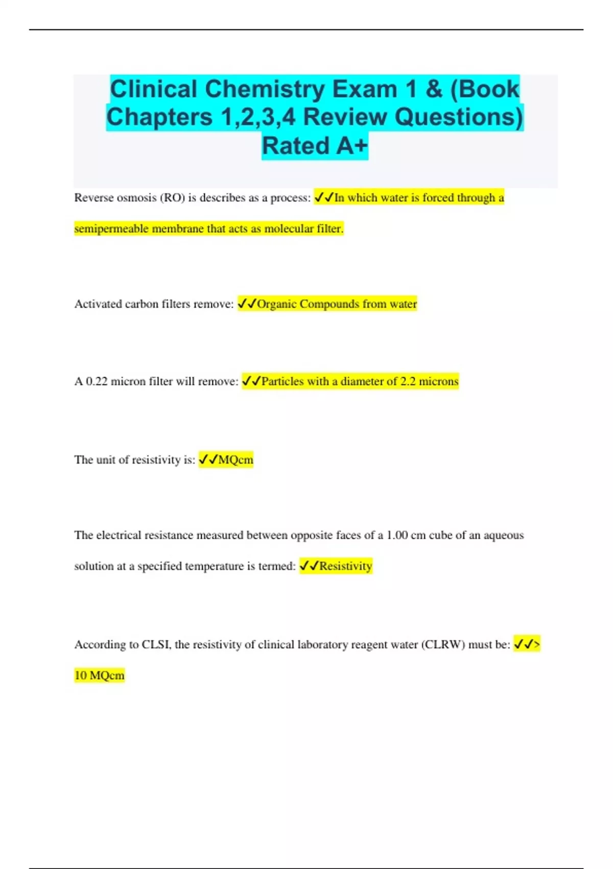 Clinical Chemistry Exam 1 & (Book Chapters 1,2,3,4 Review Questions) Rated A+ Reverse osmosis (RO) is describes as a process: In which water is forced through a semipermeable membrane that acts as molecular filter. Activated carbon filters remove: Organic Compounds from water A 0.22 micron filter will remove: Particles with a diameter of 2.2 microns The unit of resistivity is: MQcm The electrical resistance measured between opposite faces of a 1.00 cm cube of an aqueous solution at a specified temperature is termed: Resistivity According to CLSI, the resistivity of clinical laboratory reagent water (CLRW) must be: > 10 MQcm Which of the following should not be stored in borosilicate glass because it will etch the inside surface of the glass container? Strong bases (caustics) Low actinic glassware has which of the following properties? High thermal resistance with an amber or red color added as an integral part of the glass Care must be taken before selecting polyethylene plastic for use as test tubes and disposable transfer pipettes because? Polyethylene can bind or absorb proteins, dyes, stains, and picric acid Which of the following classes of glassware, including pipettes, is manufactured and calibrated to deliver the most accurate volume of liquid? A A to deliver to TD pipettes are designed to: Drain by gravity Which of the following devices is used to calibrate laboratory thermometers? Gallium melting point cell Convert 75 mg/dL to mg/L 750 mg/L Convert 70.0 mg/dL glucose to mmol/L glucose 3..89 mmol/L If a thermometer reads 39F, what is the equivalent degree C? 3.9C Convert 200 picograms to grams 2.0 x 10-10 grams A patients calcium result is 8.0 mg/dL. Conver this result to mmol/L 2.0 mmol/L The surface area of a laboratory bench measures 12 square feet. What is the surface area in square meters? 1.115 square meters A 24 hours stool specimen weighs 0.50 pounds. What is the weigh tin kilograms? 0.2265 kilograms A 1 to 4 dilution must be prepared to make a total volume of 100.0 uL. How much serum must be used? 25ul A patients creatinine is outside the linear range of the analyzer; 10ul of serum is added to 90.0 ul of diluent and the diluted sample is reanalyzed. The creatinine value of the diluted sample is 1.0 mg/dL. which of the following creatinine values is correct? 10.0 mg/dL If 10 ml of sample is added to 190ml of diluent, what is the dilution factor? 20 A serum creatinine kinase is diluted 1/200 with a result of 50 U/L. What is the patients actual amylase result? 10,000 How many grams of sodium hydroxide (NaOH) are required to prepare 250 ml of a 1.00 molar solution? 10.0g What