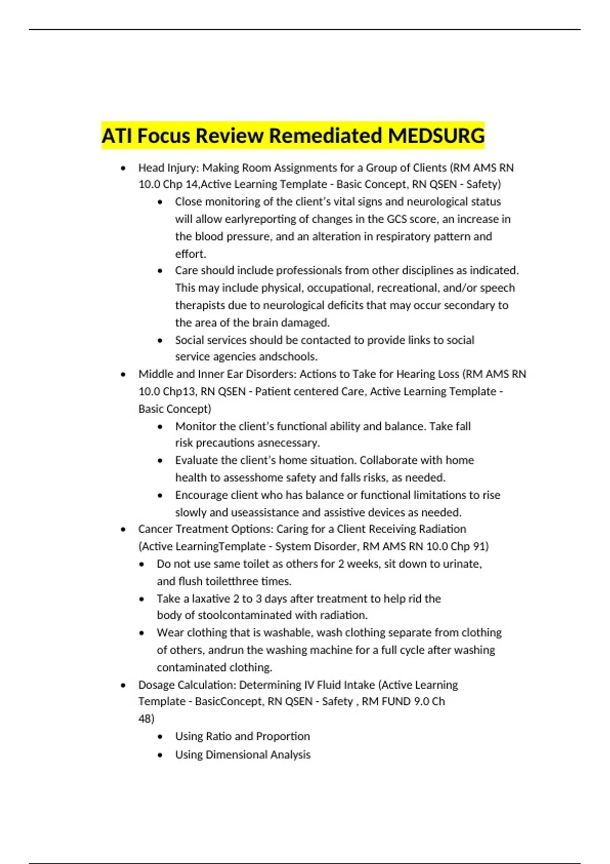 • Head Injury: Making Room Assignments for a Group of Clients (RM AMS RN 10.0 Chp 14,Active Learning Template - Basic Concept, RN QSEN - Safety) • Close monitoring of the client’s vital signs and neurological status will allow earlyreporting of changes in the GCS score, an increase in the blood pressure, and an alteration in respiratory pattern and effort. • Care should include professionals from other disciplines as indicated. This may include physical, occupational, recreational, and/or speech therapists due to neurological deficits that may occur secondary to the area of the brain damaged. • Social services should be contacted to provide links to social service agencies andschools. • Middle and Inner Ear Disorders: Actions to Take for Hearing Loss (RM AMS RN 10.0 Chp13, RN QSEN - Patient centered Care, Active Learning Template - Basic Concept) • Monitor the client’s functional ability and balance. Take fall risk precautions asnecessary. • Evaluate the client’s home situation. Collaborate with home health to assesshome safety and falls risks, as needed. • Encourage client who has balance or functional limitations to rise slowly and useassistance and assistive devices as needed. • Cancer Treatment Options: Caring for a Client Receiving Radiation (Active LearningTemplate - System Disorder, RM AMS RN 10.0 Chp 91) • Do not use same toilet as others for 2 weeks, sit down to urinate, and flush toiletthree times. • Take a laxative 2 to 3 days after treatment to help rid the body of stoolcontaminated with radiation. • Wear clothing that is washable, wash clothing separate from clothing of others, andrun the washing machine for a full cycle after washing contaminated clothing. • Dosage Calculation: Determining IV Fluid Intake (Active Learning Template - BasicConcept, RN QSEN - Safety , RM FUND 9.0 Ch 48) • Using Ratio and Proportion • Using Dimensional Analysis Desired Over Have