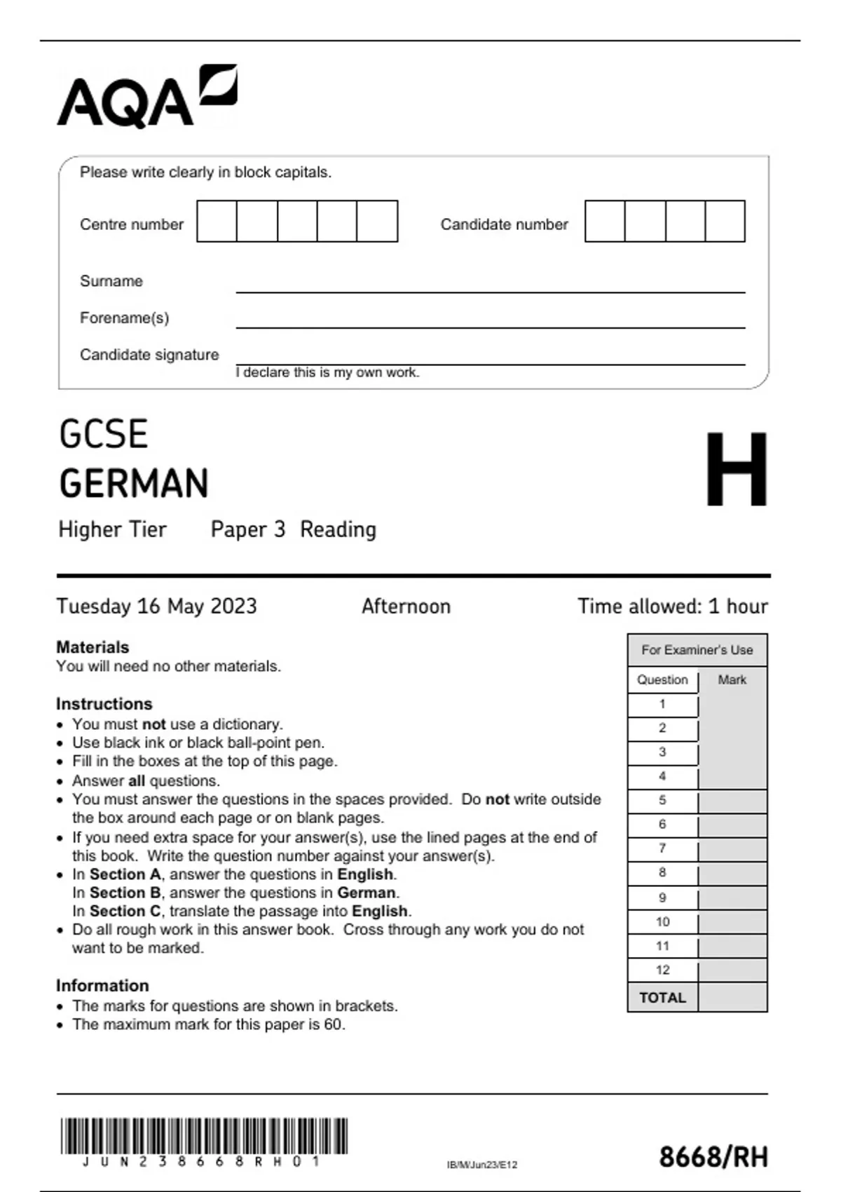 Tuesday 16 May 2023 Afternoon Time allowed: 1 hour