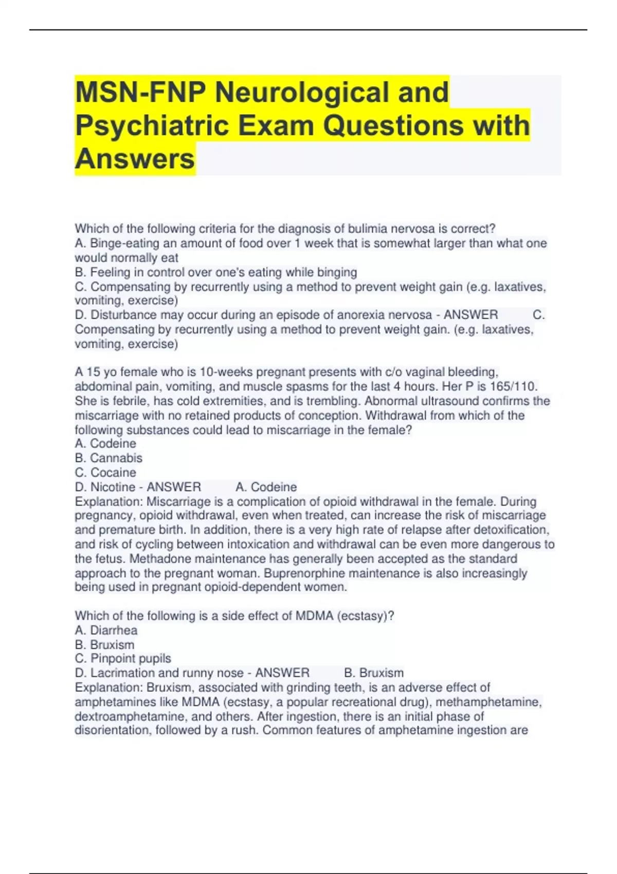 MSN-FNP Neurological and Psychiatric Exam Questions with Answers Which of the following criteria for the diagnosis of bulimia nervosa is correct? A. Binge-eating an amount of food over 1 week that is somewhat larger than what one would normally eat B. Feeling in control over one's eating while binging C. Compensating by recurrently using a method to prevent weight gain (e.g. laxatives, vomiting, exercise) D. Disturbance may occur during an episode of anorexia nervosa - ANSWER C. Compensating by recurrently using a method to prevent weight gain. (e.g. laxatives, vomiting, exercise) A 15 yo female who is 10-weeks pregnant presents with c/o vaginal bleeding, abdominal pain, vomiting, and muscle spasms for the last 4 hours. Her P is 165/110. She is febrile, has cold extremities, and is trembling. Abnormal ultrasound confirms the miscarriage with no retained products of conception. Withdrawal from which of the following substances could lead to miscarriage in the female? A. Codeine B. Cannabis C. Cocaine D. Nicotine - ANSWER A. Codeine Explanation: Miscarriage is a complication of opioid withdrawal in the female. During pregnancy, opioid withdrawal, even when treated, can increase the risk of miscarriage and premature birth. In addition, there is a very high rate of relapse after detoxification, and risk of cycling between intoxication and withdrawal can be even more dangerous to the fetus. Methadone maintenance has generally been accepted as the standard approach to the pregnant woman. Buprenorphine maintenance is also increasingly being used in pregnant opioid-dependent women. Which of the following is a side effect of MDMA (ecstasy)? A. Diarrhea B. Bruxism C. Pinpoint pupils D. Lacrimation and runny nose - ANSWER B. Bruxism Explanation: Bruxism, associated with grinding teeth, is an adverse effect of amphetamines like MDMA (ecstasy, a popular recreational drug), methamphetamine, dextroamphetamine, and others. After ingestion, there is an initial phase of disorientation, followed by a rush. Common features of amphetamine ingestion are pallor, tremors, muscle twitching, bruxism, perspiration, chills, vomiting, decreased appetite, insomnia, euphoria, agitation, elation, tachycardia, hypertension, and anxiety. Oppositional defiant or conduct disorders coexist with ADHD in ~35% of children. Oppositional defiant disorder includes persistent symptoms of negativistic, defiant, disobedient and hostile behaviors toward authority figures. Which of the following is an appropriate behavioral therapeutic intervention? A. Positive reinforcement B. Intention disobedience C. Object-oriented satiation D. Marks-Sachs division - ANSWER A. Positive reinforcement Which of the following is an example of a method of a behavior therapy technique for anorexic or bulimic patients who binge and purge? A. Have another person portion out their meals B. Have a supervisor watch them to ensure that they do not binge C. Have a supervisor watch them for 2-3 hours after every meal D. Have them keep a log of when they feel like bingeing or purging - ANSWER C. Have a supervisor watch them for 2-3 hours after every meal. What medication is the first-line therapy for TIAs? A. Carbamazepine (Tegretol) 100 mg B. Donepezil (Aricept) 23 mg C. Clonidine (Catapress) 0.1 mg D. Clopidogrel (Plavix) 75 mg - ANSWER D. Clopidogrel (Plavix) 75 mg Explanation: Antiplatelet therapy is recommended as treatment for TIAs. ASA and AHA guidelines recommend aspirin, Aggrenox, and Clopidogrel as first line agents. (A) Carbamazepine is used in the prevention of seizures as well as bipolar and nerve pain. (B) Donepezil is used in the treatment of dementia for Alzheimer's type. (C) Clonidine is used in the treatment of HTN, but is not the first line of choice. You are evaluating a 2 yo boy with red discoloration on the left face that has been present since birth. Parental, perinatal, postnatal, and family history were unremarkable. He is developmentally delayed. Exam revealed a well child with a flat, pink to red discoloration measuring approximately 10.5 cm by 9cm, with well defined borders, involving the skin of the left upper and lower eyelids overlying the left zygoma down to the left mandible, involving the skin above and below the lips but no crossing the midline. The color deepened when the child cried. Optimum further evaluation should include: A. Skull radiography B. Ophthalmology evaluation C. Cranial MRI with contrast D. Ophthalmology evaluation and cranial MRI with contrast. - ANSWER D