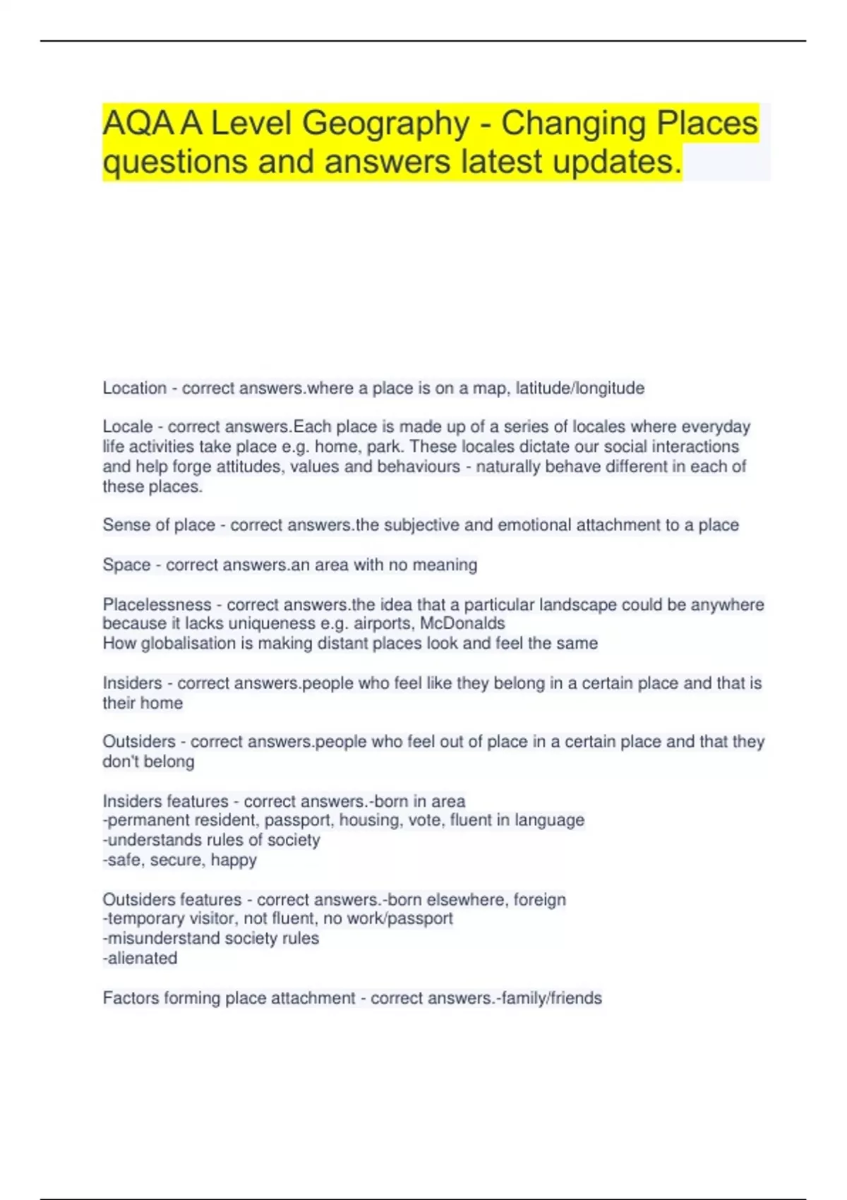 AQA A Level Geography - Changing Places questions and answers latest updates. Location - correct a place is on a map, latitude/longitude Locale - correct answers.Each place is made up of a series of locales where everyday life activities take place e.g. home, park. These locales dictate our social interactions and help forge attitudes, values and behaviours - naturally behave different in each of these places. Sense of place - correct subjective and emotional attachment to a place Space - correct area with no meaning Placelessness - correct idea that a particular landscape could be anywhere because it lacks uniqueness e.g. airports, McDonalds How globalisation is making distant places look and feel the same Insiders - correct e who feel like they belong in a certain place and that is their home Outsiders - correct e who feel out of place in a certain place and that they don't belong Insiders features - correct answers.-born in area -permanent resident, passport, housing, vote, fluent in language -understands rules of society -safe, secure, happy Outsiders features - correct answers.-born elsewhere, foreign -temporary visitor, not fluent, no work/passport -misunderstand society rules -alienated Factors forming place attachment - correct answers.-family/friends