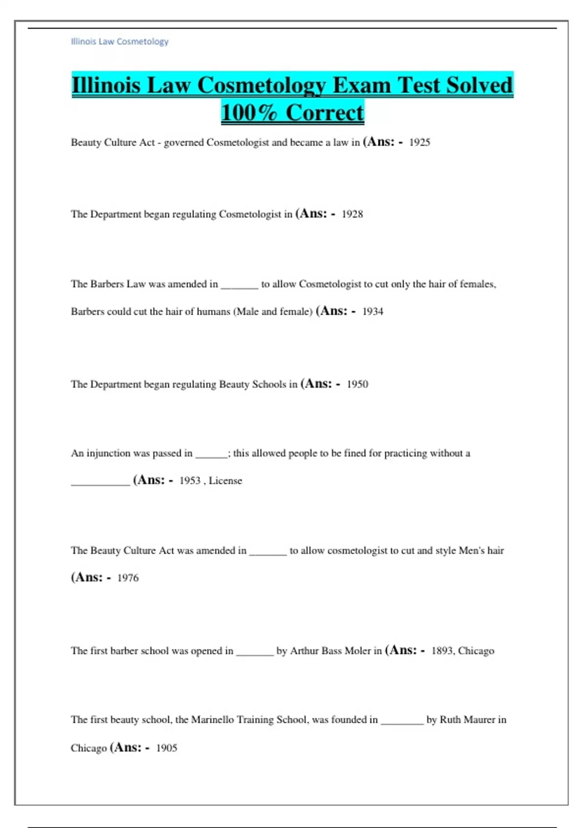 Illinois Law Cosmetology Exam Test Solved 100% Correct Beauty Culture Act - governed Cosmetologist and became a law in (Ans: - 1925 The Department began regulating Cosmetologist in (Ans: - 1928