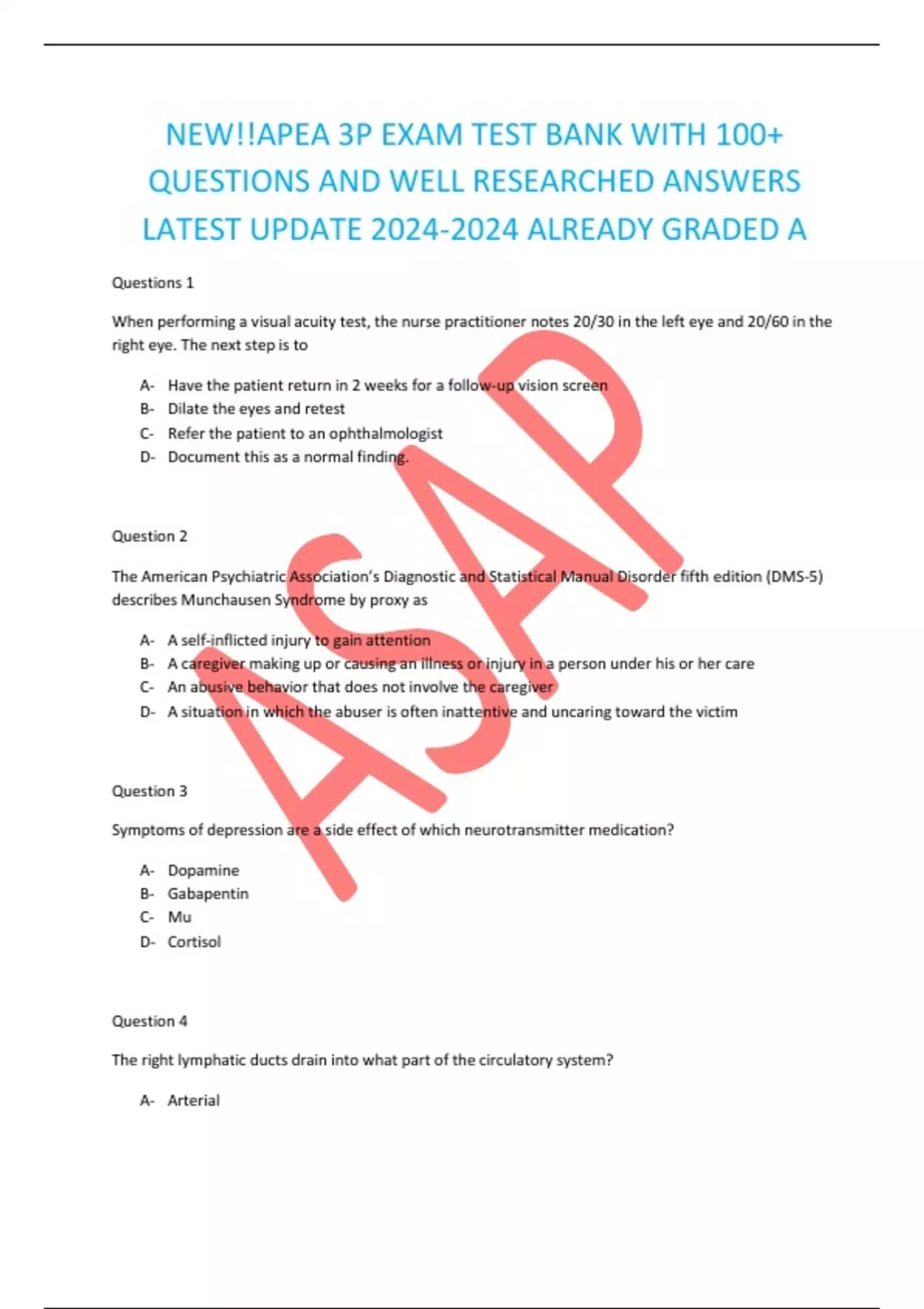 NEW!!APEA 3P EXAM TEST BANK WITH 100+ QUESTIONS AND WELL RESEARCHED ANSWERS LATEST UPDATE ALREADY GRADED A