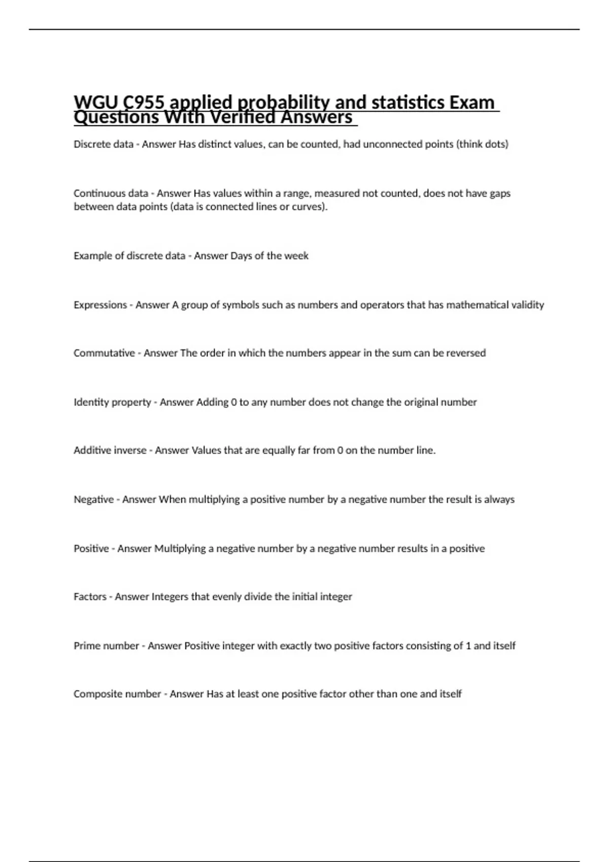 Discrete data - Answer Has distinct values, can be counted, had unconnected points (think dots) Continuous data - Answer Has values within a range, measured not counted, does not have gaps between data points (data is connected lines or curves). Example of discrete data - Answer Days of the week Expressions - Answer A group of symbols such as numbers and operators that has mathematical validity Commutative - Answer The order in which the numbers appear in the sum can be reversed Identity property - Answer Adding 0 to any number does not change the original number Additive inverse - Answer Values that are equally far from 0 on the number line. Negative - Answer When multiplying a positive number by a negative number the result is always Positive - Answer Multiplying a negative number by a negative number results in a positive Factors - Answer Integers that evenly divide the initial integer Prime number - Answer Positive integer with exactly two positive factors consisting of 1 and itself Composite number - Answer Has at least one positive factor other than one and itself Factorization - Answer Process of breaking up a composite number into its prime factors fundamental theorem of arithmetic - Answer Any integer greater than one is either Prime or the product of Prime numbers Principal square root - Answer Positive square root of a number Radican - Answer Number under radical sign √16=4 Open Circle - Answer Represents less than or greatest than on the number line Perfect square - Answer Product of any integer with itself yields a perfect square. Whole numbers - Answer positive numbers with a whole value Integers - Answer Numbers with no fractions or decimal value but can be positive or negative Rational numbers - Answer Numbers that can be expressed as a fraction or decimal values that have that end or repeat forever. Includes all integers since all integers can be expressed as fractions. Real numbers - Answer Everything that can be included in a number line including pi. Fractions - Answer Express numbers which are part of a whole