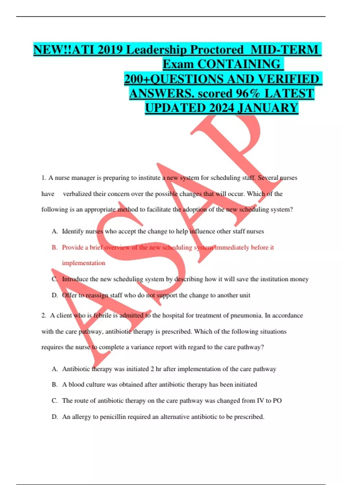 NEW!!ATI 2019 Leadership Proctored MID-TERM Exam CONTAINING 200+QUESTIONS AND VERIFIED ANSWERS. scored 96% LATEST UPDATED 2024 JANUARY