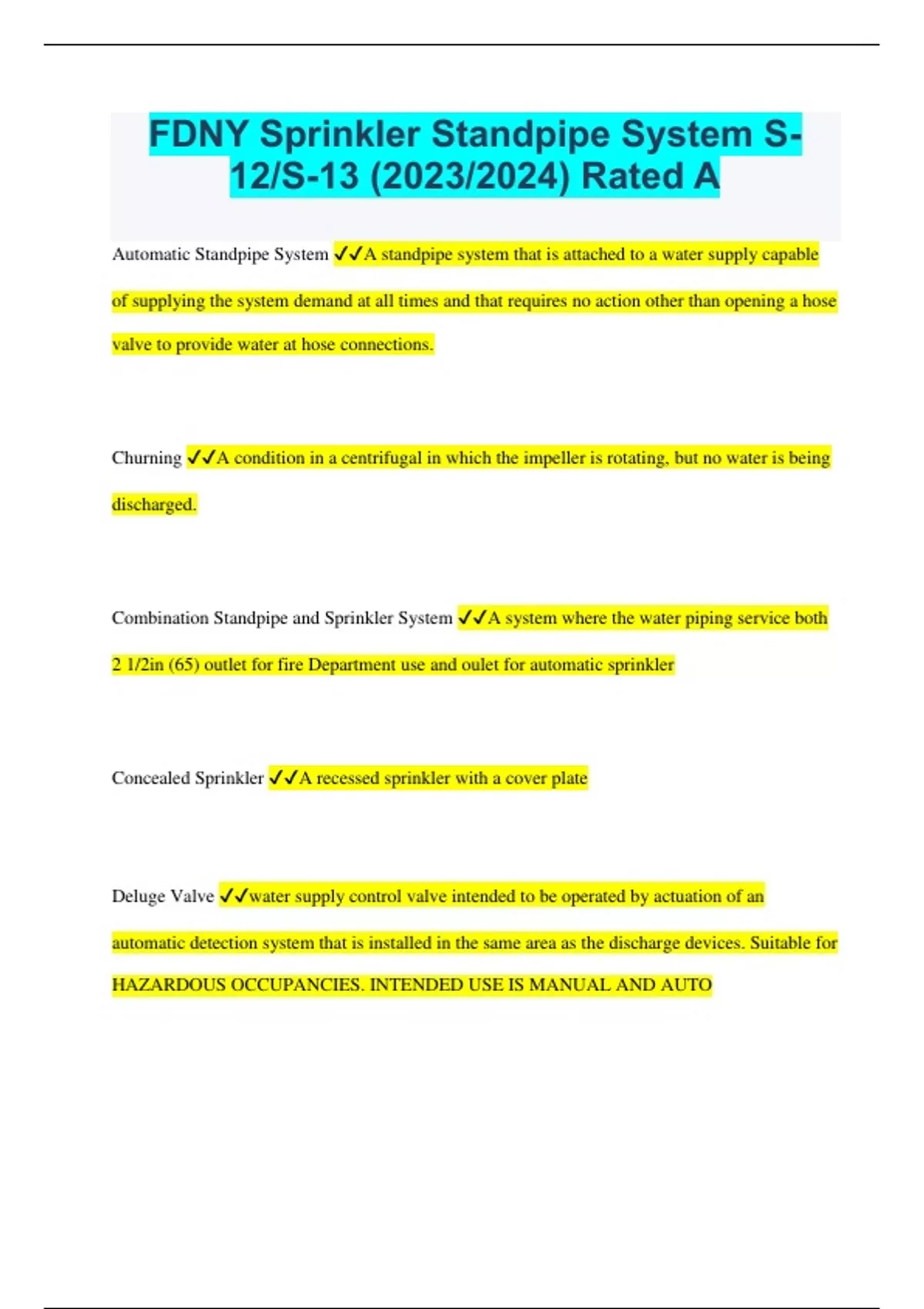 FDNY Sprinkler Standpipe System S-12/S-13 (2023/2024) Rated A Automatic Standpipe System A standpipe system that is attached to a water supply capable of supplying the system demand at all times and that requires no action other than opening a hose valve to provide water at hose connections. Churning A condition in a centrifugal in which the impeller is rotating, but no water is being discharged. Combination Standpipe and Sprinkler System A system where the water piping service both 2 1/2in (65) outlet for fire Department use and oulet for automatic sprinkler Concealed Sprinkler A recessed sprinkler with a cover plate Deluge Valve water supply control valve intended to be operated by actuation of an automatic detection system that is installed in the same area as the discharge devices. Suitable for HAZARDOUS OCCUPANCIES. INTENDED USE IS MANUAL AND AUTO Deludge Sprinkler System A sprinkler system employing open sprinklers that are attached to a piping system that is connected to a water supply through a VALVE that is opened of a DETECTION SYSTEM installed in the same area as the sprinklers Dry Pipe Sprinkler System A sprinkler system employing automatic sprinklers that are attached to a piping system containing air or nitrogen under pressure. The release of the air or nitrogen,(as from the opening of a sprinkler) results in the water pressure opening a valve known as a dry pipe valve, resulting in the flow of water into the piping system and out of the fused sprinklers heads. Dry Sprinkler A sprinkler secured in an extension nipple that has a seal at the inlet to prevent water from entering the nipple until the sprinkler operates. May be configured with an upright, pendent or sidewall sprinkler. AUTO/NON_AUTO Dry Standpipe A standpipe system designed to have piping contain water only when the system is being utilized (NO AUTOMATIC WATER SUPPLY) Fire Department Connection A connection, normally on the exterior of the building. (FORMERLY KNOW AS SIAMESE CONNECTION) Fire Hose A flexible conduit constructed of one or more reinforcements (JACKETS), Fire Hydrant A valve connection on a water supply system having one or more outlets and that is used to supply hose and fire department pumps with water. Bulb Sprinkler A sprinkler operated by heat breaking a glass bulb filled with a non-freezing liquid with diamiter that vary from 3mm for quick response sprinklers to 5mm for standard response sprinklers. Hose Connection a combination of equipment provided for connection of a hose to the standpipe system that includes a hose valve with a threaded outlet. Hose Station a combination of a hose rack, hose nozzle, hose, and hose connection. Impairment Coordinator Person responsible for ensuring the proper safety precautions are taken when the fire protection system is placed out of service (designated by the owner) In Service The Status of hose stored in a hose house, on a rack or reel, or on a fire apparatus that is available and ready for immediate use at an incident. Personal Supervision Supervision by the holder of a department certificate who is required to be personally present on the premises, or other proximate location acceptable to the department, while the duties for which the certificate is required is being performed. Pressure Restricting Device A valve or device designed for the purpose of reducing of reducing the downstream water pressure under both flowing (residual) and non-flowing (static) conditions Pressure Reducing Valve A valve or device designed for the purpose of reducing of reducing the downstream water pressure under flowing (residual) conditions only. Pressure Tank A tank using air pressure to supplying water for water-based fire protection systems. Tank contents to be maintained at one third air to two thirds water. Quick Response Sprinkler Head A sprinkler having a fusible link with a response time index (RTI) of 50 or less. Recessed Sprinkler A sprinkler in which all or part of the body, other than the shank thread, is mounted above the ceiling. Standpipe System An arrangement of piping, valves, and hose connections installed in a structure to deliver water for fire hoses. Combination Standpipe and Sprinkler System A system where the fire protection piping services both 21⁄2 in. (65 mm) outlets for fire department use and outlets for automatic sprinklers. Static Pressure The measurement of sytem pressure inder NON FLOW CONDITIONS. Standpipe/ Multi-Zone A standpipe system