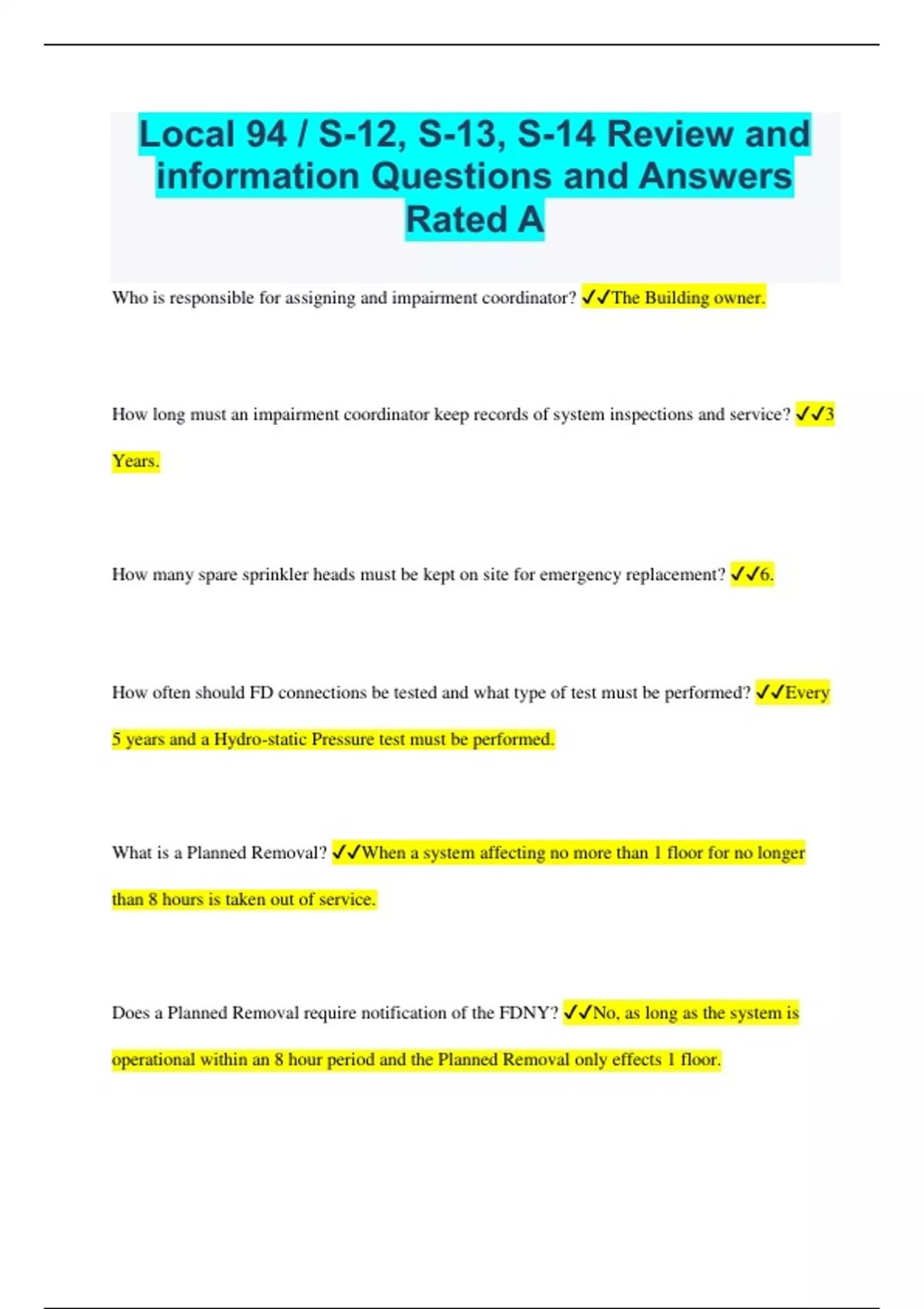 Local 94 / S-12, S-13, S-14 Review and information Questions and Answers Rated A Who is responsible for assigning and impairment coordinator? The Building owner. How long must an impairment coordinator keep records of system inspections and service? 3 Years. How many spare sprinkler heads must be kept on site for emergency replacement? 6. How often should FD connections be tested and what type of test must be performed? Every 5 years and a Hydro-static Pressure test must be performed. What is a Planned Removal? When a system affecting no more than 1 floor for no longer than 8 hours is taken out of service. Does a Planned Removal require notification of the FDNY? No, as long as the system is operational within an 8 hour period and the Planned Removal only effects 1 floor. What is an Unplanned out of service? When a fire system is taken off line for emergency repairs. Particularly for longer than a period of 8 hours. Does an Unplanned out of service need to be reported to the FD, if so, who is to report the Unplanned out of service? Yes, it must be immediately reported to the Building Owner and the FD Borough Communication Office by a person holding the C of F, Impairment Coordinator or other person responsible for the Fire Protection System. What information should an out of service notification include? 1. A brief description and the extent of the O.O.S condition. 2. The area affected. 3. Type of occupancy. 4. Estimated time of O.O.S. 5. Name and phone number of person notifying. What should a C of F do if he observes a minor defect in the system? The C of F should report the defect to the building owner. After a minor defect is identified and the proper personnel are informed, how long of a time period do they have to make the necessary corrections and what will occur if they do not make the necessary corrections within said time period? 30 days otherwise it shall be considered an impaired system and reported to the FDNY. How are O.O.S planned and unplanned immediately identified? By the placement of tags at each FD connection, Control Valve, Fire Command or Visible Lobby Location. What color disc is to be used for an unplanned O.O.S condition and where are said discs to be placed? A white or blue disc shall be placed at all affected FD connections. Who is to ensure and verify placement of discs? The impairment coordinator or building owner is to ensure placement of discs by a M.F.S.P.C, M.L.P or FDNY units. What color tags and discs are to be placed when a system is fully O.O.S, who is to place them, where are they to be placed and who is to verify placement? A red tag is to be placed on the main control valve and a white disc is to be placed at the FD connections by the M.F.S.P.C or M.L.P. Placement is to be verified by the impairment coordinator or the building owner. What color discs and tags are to be placed when the system is partially O.O.S and where? A red tag is to be placed at the main control valve and a blue disc is to be placed at the FD connections. What preliminary steps are to be verified and by whom during a planned removal from service? the Impairment coordinator and C of F are to