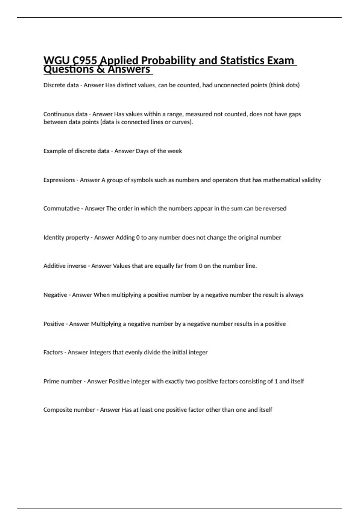 Discrete data - Answer Has distinct values, can be counted, had unconnected points (think dots) Continuous data - Answer Has values within a range, measured not counted, does not have gaps between data points (data is connected lines or curves). Example of discrete data - Answer Days of the week Expressions - Answer A group of symbols such as numbers and operators that has mathematical validity Commutative - Answer The order in which the numbers appear in the sum can be reversed Identity property - Answer Adding 0 to any number does not change the original number Additive inverse - Answer Values that are equally far from 0 on the number line. Negative - Answer When multiplying a positive number by a negative number the result is always Positive - Answer Multiplying a negative number by a negative number results in a positive Factors - Answer Integers that evenly divide the initial integer Prime number - Answer Positive integer with exactly two positive factors consisting of 1 and itself Composite number - Answer Has at least one positive factor other than one and itself Factorization - Answer Process of breaking up a composite number into its prime factors fundamental theorem of arithmetic - Answer Any integer greater than one is either Prime or the product of Prime numbers Principal square root - Answer Positive square root of a number Radican - Answer Number under radical sign √16=4 Open Circle - Answer Represents less than or greatest than on the number line Perfect square - Answer Product of any integer with itself yields a perfect square. Whole numbers - Answer positive numbers with a whole value Integers - Answer Numbers with no fractions or decimal value but can be positive or negative Rational numbers - Answer Numbers that can be expressed as a fraction or decimal values that have that end or repeat forever. Includes all integers since all integers can be expressed as fractions. Real numbers - Answer Everything that can be included in a number line including pi. Fractions - Answer Express numbers which are part of a whole Numerator - Answer Number written before the slash or above the fraction bar Proper fraction - Answer Numerator is less than denominator and the value of the fraction is less than one Improper fraction - Answer Numerator is greater than denominator and therefore is greater than one except with negative fractions Mixed numbers - Answer A whole number and proper fraction. A negative sign in front applies to both parts of the mixed number. Multiples - Answer Integers created by multiplying one number times another number Fractions - Answer Express numbers which are part of a whole Numerator - Answer Number written before the slash or above the fraction bar Proper fraction - Answer Numerator is less than denominator and the value of the fraction is less than one Improper fraction - Answer Numerator is greater than denominator and therefore is greater than one except with negative fractions Mixed numbers - Answer A whole number and proper fraction. A negative sign in front applies to both parts of the mixed number. Multiples - Answer Integers created by multiplying one number times another number Reciprocal - Answer The number which of multiplied by divisor gives you one (like the fraction flipped over) Terminal decimal - Answer Has digits that end Ratio - Answer Comparison of two numbers Rate - Answer A ratio that compares two quantities having different units of measure Proportion - Answer True statement in which two ratios are equal to each other. Two days are proportional of they are equivalent. Conditional proportion - Answer One part of a proportion is a variable or unknown quantity Celsius to Fahrenheit - Answer Celsius x 9/5 + 32 Fahrenheit to Celsius - Answer (Fahrenheit - 32) x 5/9 Constant - Answer Number with a fixed value. All real numbers are constants Elementary operations - Answer Addition, subtraction, multiplication, division Base - Answer The number an exponent is written next to Variable - Answer Symbol that represents our holds the place of a numerical value Coefficient - Answer A number by which a variable is being multiplied. Coefficients are written in front of variables. 16x, 16 is coefficient. If there is no number you assume an invisible1. Term - Answer Can be a single constant, a single, or a number of constants and variables multiplied together. Algebraic expression - Answer String of terms connected by division, addition, and subtraction. How to write an algebraic expression - Answer Constants at end. Write terms with the largest exponents first. Always write in descending order of exponent value with constants at the end. Inverse operation - Answer Operations that undo each other. Subtraction is inverse of addition. Division is inverse of multiplication. Like terms - Answer Have the same variable with the same exponent Degree of an expression - Answer Refers to largest exponent in an expression Linear - Answer Has degree of 1 Quadratic - Answer Has degree of 2 Cubic - Answer Has degree of 3 Constant - Answer Has degree of 0 Distributive property - Answer Principle used to multiply a single term by multiple terms. If there are parenthesis around multiple terms which are in turn multiplied by a single term, we can use this property.