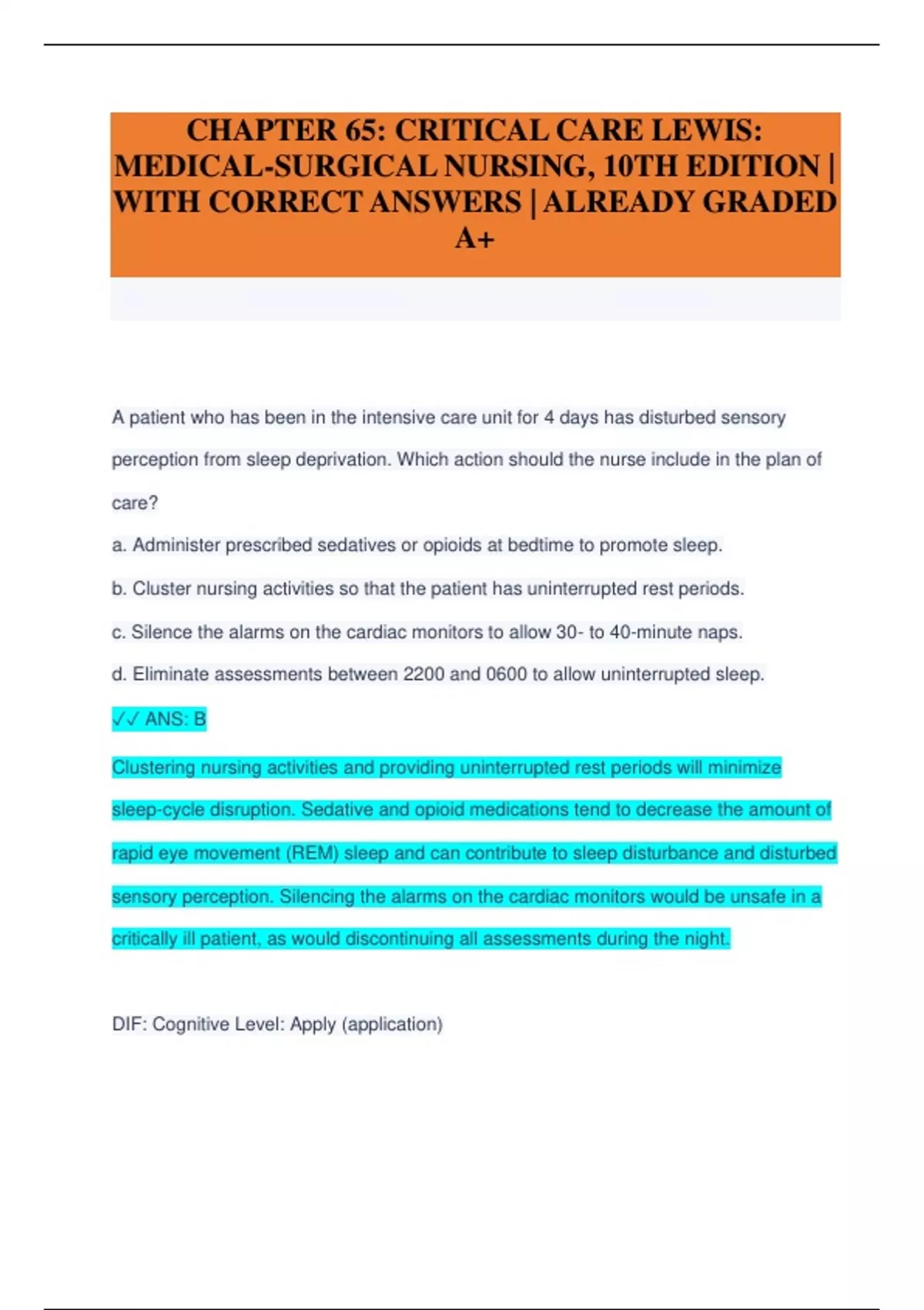 A patient who has been in the intensive care unit for 4 days has disturbed sensory perception from sleep deprivation. Which action should the nurse include in the plan of care? a. Administer prescribed sedatives or opioids at bedtime to promote sleep. b. Cluster nursing activities so that the patient has uninterrupted rest periods. c. Silence the alarms on the cardiac monitors to allow 30- to 40-minute naps. d. Eliminate assessments between 2200 and 0600 to allow uninterrupted sleep. ANS: B Clustering nursing activities and providing uninterrupted rest periods will minimize sleep-cycle disruption. Sedative and opioid medications tend to decrease the amount of rapid eye movement (REM) sleep and can contribute to sleep disturbance and disturbed sensory perception. Silencing the alarms on the cardiac monitors would be unsafe in a critically ill patient, as would discontinuing all assessments during the night.
