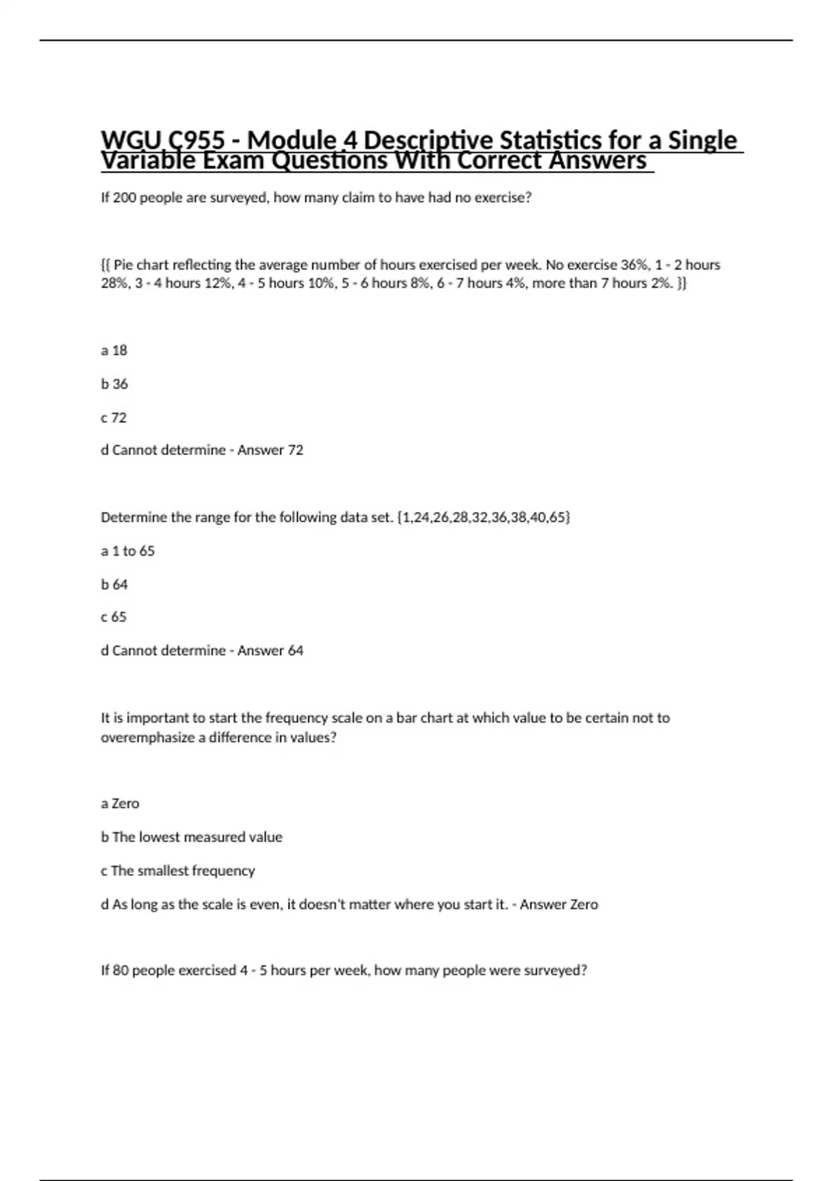 If 200 people are surveyed, how many claim to have had no exercise? {{ Pie chart reflecting the average number of hours exercised per week. No exercise 36%, 1 - 2 hours 28%, 3 - 4 hours 12%, 4 - 5 hours 10%, 5 - 6 hours 8%, 6 - 7 hours 4%, more than 7 hours 2%. }} a 18 b 36 c 72 d Cannot determine - Answer 72 Determine the range for the following data set. {1,24,26,28,32,36,38,40,65} a 1 to 65 b 64 c 65 d Cannot determine - Answer 64 It is important to start the frequency scale on a bar chart at which value to be certain not to overemphasize a difference in values? a Zero b The lowest measured value c The smallest frequency d As long as the scale is even, it doesn't matter where you start it. - Answer Zero If 80 people exercised 4 - 5 hours per week, how many people were surveyed? {{ Pie chart reflecting the average number of hours exercised per week. No exercise 36%, 1 - 2 hours 28%, 3 - 4 hours 12%, 4 - 5 hours 10%, 5 - 6 hours 8%, 6 - 7 hours 4%, more than 7 hours 2%. }} a 80 b 800 c 400 d 50 - Answer 800 You are a professional trainer at a local sports academy. You ask your athletes to determine the number of grams of protein they consume for a particular meal. Which of the following would be the best choice to illustrate the shape of the data you collect? a Bar chart b Pie chart c Box plot d None of the above - Answer Box plot What is the most significant difference between histograms and bar charts? a The number of bars used b The use of labels on the axes c The type of data depicted in the graph d The coloring used for each bar - Answer The type of data depicted in the graph Of the following sets of data, which would you assume should have the greatest range? a Age when a baby gets their first tooth b Age of first-year business students c Age of death d Age of high school graduate - Answer Age of death Determine any outliers in the following data set. {1,24,26,28,32,36,38,40,65} a 1 b 65 c A and B d None - Answer A and B Determine the interquartile range ( IQR ) for the following set of diagnostic test scores. {60,47,65,85,81,77,70,56,47,84,75} a 25 b 57 c 68 d 80 - Answer 25 Stem plots display which type of data? a Quantitative b Categorical c Neither Quantitative nor categorical d Quantitative and categorical - Answer Quantitative Determine the median for the following set of diagnostic test scores.{60,47,65,85,81,77,70,56,47,84,75} a 67 b 70 c 47 d 67.9 - Answer 70 Determine Q3 for the sorted list of data values. {3,8,8,10,16,20,20,23,27,37,44,45,62,71} a 27 b 37 c 44 d 45 - Answer 44 The bitrate of audio files in a sample group of files ranged from 160 kilobytes per second (Kbps) to 256 kilobytes per second (Kbps). What percentage of the audio files will fall within 2 standard deviations of the mean? Assume the data is normally distributed. a 34% b 68% c 95% d 99.7% - Answer 95% Which of the following are best used to display categorical data? a Histogram b Dot plot c Pie chart d Stem plot - Answer Pie chart When observing a box plot, what percentage of the measured data lies between Q1 and the maximum value in the list? a 75% b 50% c 25% d Cannot determine. - Answer 75% Which of the four different sets of numbers would have the greatest standard deviation? a 5,5,5,5,5 b 5,6,7,8,9 c 1,8,16,25,33 d 40,43,45,47 - Answer 1,8,16,25,33 Determine the best estimate for the total number of ice creams sold on Monday and Tuesday. {{ Bar Chart reflecting the average number of ice creams sold on each day of the week. Mon. 70, Tue. between 60 and 70, Wed. between 50 and 60, Thur. between 40 and 50, Fri. between 60 and 70, Sat between 30 and 40, Sun. 30. }} a 100 b 112 c 137 d 148 - Answer 137 Please use the dot plot below to answer the following question. Dot Plot displaying the following data points: 5, 6, 6, 7, 8, 8, 8, 9, 9, 10. Determine the median for the data. a 7 b 7.5 c 8 d Cannot determine. - Answer 8 The return on investment (ROI) in a sample population of investments ranged from 8% to 23% . What percentage of the sample will fall within 1 standard deviation above the mean? Assume the data is normally distributed. a 47.5% b 13.5% c 68% d 34% - Answer 34% Arrange the mean, median, and mode in order from least to greatest in a distribution that it is positively skewed. a Median, mode, mean b Mean, median, mode c Mean, mode, median d Mode, median, mean - Answer Mode, median, mean If the following data are represented on a stem plot, how many leaves would be shown on the " 6 " stem? {57,63,55,59,52,60,65,56,56,65,55,63} a 5 b 4 c 3 d 2 - Answer 5