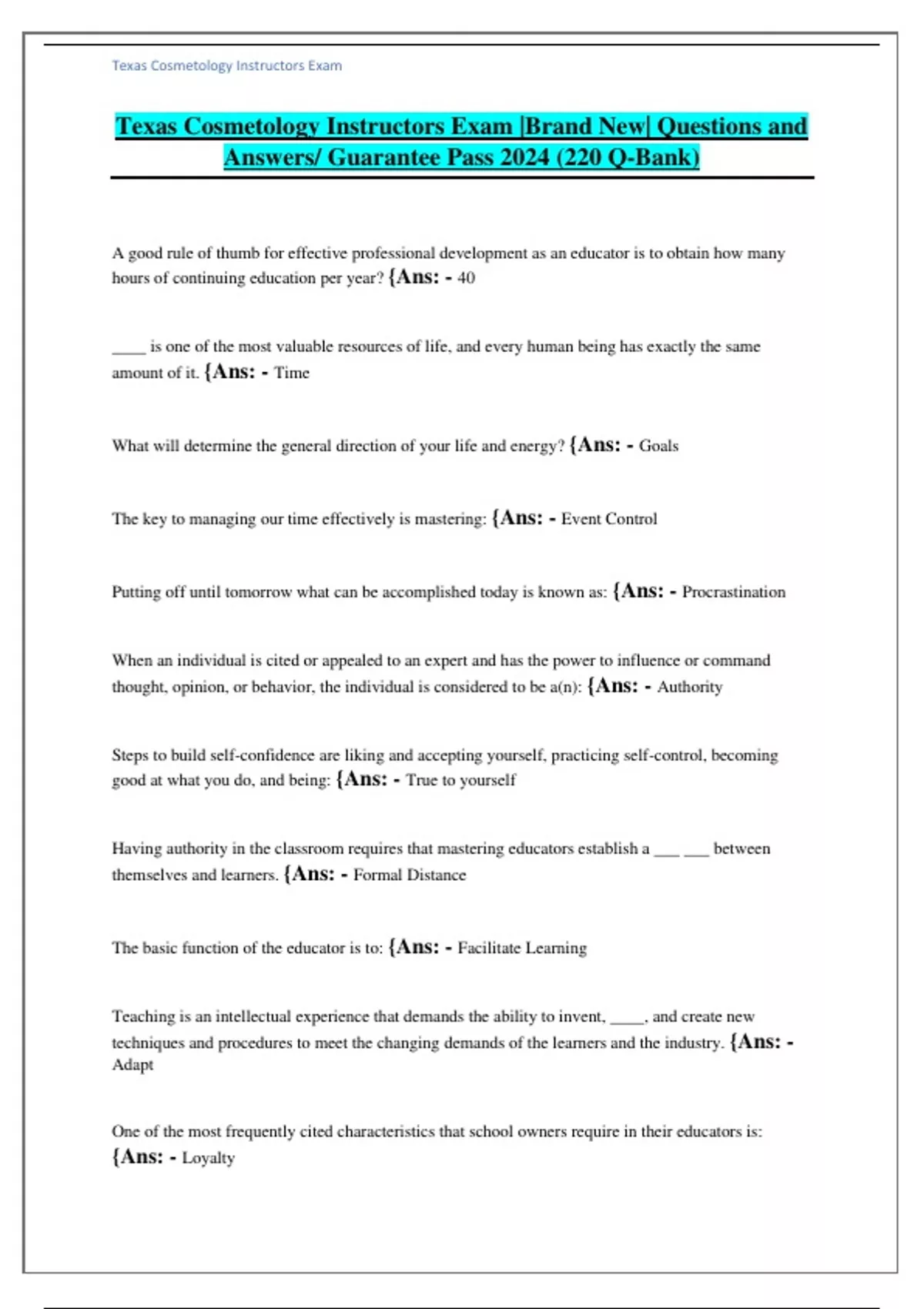 Texas Cosmetology Instructors Exam |Brand New| Questions and Answers/ Guarantee Pass 2024 (220 Q-Bank) A good rule of thumb for effective professional development as an educator is to obtain how many hours of continuing education per year? {Ans: - 40 ____ is one of the most valuable resources of life, and every human being has exactly the same amount of it. {Ans: - Time What will determine the general direction of your life and energy? {Ans: - Goals The key to managing our time effectively is mastering: {Ans: - Event Control Putting off until tomorrow what can be accomplished today is known as: {Ans: - Procrastination When an individual is cited or appealed to an expert and has the power to influence or command thought, opinion, or behavior, the individual is considered to be a(n): {Ans: - Authority Steps to build self-confidence are liking and accepting yourself, practicing self-control, becoming good at what you do, and being: {Ans: - True to yourself Having authority in the classroom requires that mastering educators establish a ___ ___ between themselves and learners. {Ans: - Formal Distance