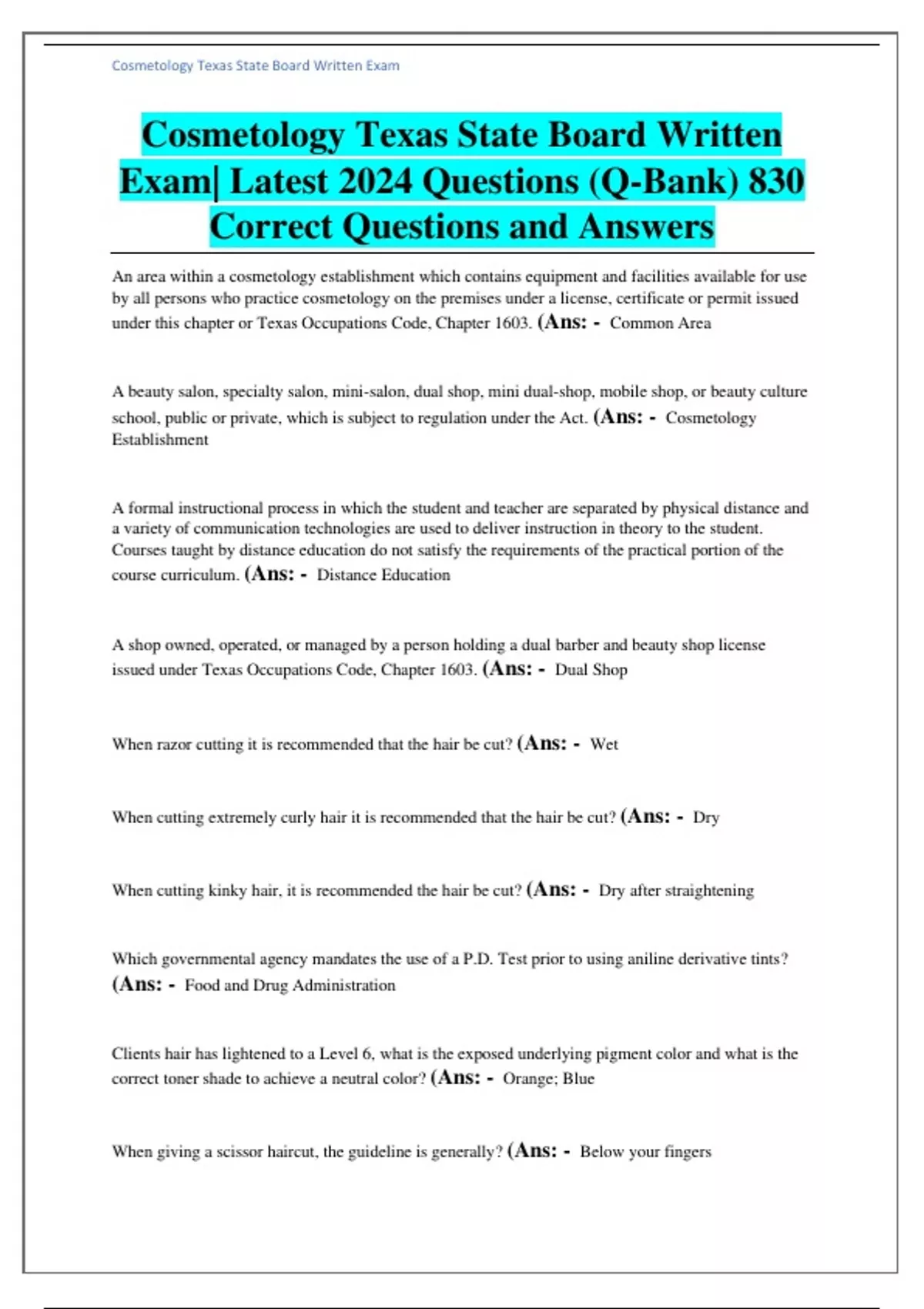 Cosmetology Texas State Board Written Exam| Latest 2024 Questions (Q-Bank) 830 Correct Questions and Answers