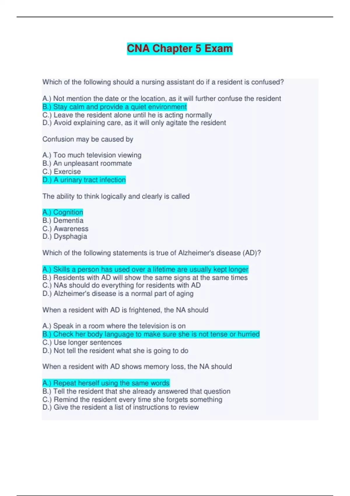 Certified Nursing Assistant | CNA Chapter 5 Exam - Questions and Answers Which of the following should a nursing assistant do if a resident is confused? A.) Not mention the date or the location, as it will further confuse the resident B.) Stay calm and provide a quiet environment C.) Leave the resident alone until he is acting normally D.) Avoid explaining care, as it will only agitate the resident Confusion may be caused by A.) Too much television viewing B.) An unpleasant roommate C.) Exercise D.) A urinary tract infection The ability to think logically and clearly is called A.) Cognition B.) Dementia C.) Awareness D.) Dysphagia Which of the following statements is true of Alzheimer's disease (AD)? A.) Skills a person has used over a lifetime are usually kept longer B.) Residents with AD will show the same signs at the same times C.) NAs should do everything for residents with AD D.) Alzheimer's disease is a normal part of aging When a resident with AD is frightened, the NA should A.) Speak in a room where the television is on B.) Check her body language to make sure she is not tense or hurried C.) Use longer sentences D.) Not tell the resident what she is going to do When a resident with AD shows memory loss, the NA should A.) Repeat herself using the same words B.) Tell the resident that she already answered that question C.) Remind the resident every time she forgets something D.) Give the resident a list of instructions to review If a resident with AD has lost most of his verbal skills, the NA should A.) Assume the resident cannot understand what is being said B.) Use touch, smiles, and laughter C.) Ask the resident questions D.) Not involve the resident in activities because he will find that frustrating If a resident with AD is incontinent, the NA should