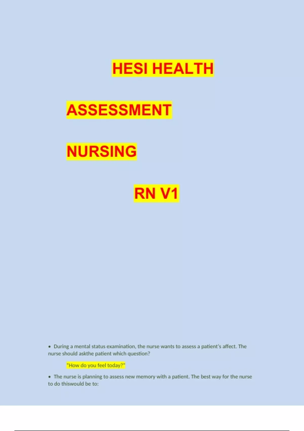 HESI HEALTH ASSESSMENT NURSING RN V1 100 Questions and Answers (2024/2025)(Verified Answers)1. During a mental status examination, the nurse wants to assess a patient’s affect. The nurse should ask the patient which question? 2. The nurse is planning to assess new memory with a patient. The best way for the nurse to do this would be to: 3. A 45-year-old woman is at the clinic for a mental status assessment. In giving her the Four Unrelated Words Test, the nurse would be concerned if she could not ____ four unrelated words ____. 4. During a mental status assessment, which question by the nurse would best assess a person’s judgment? 5. Which of these individuals would the nurse consider at highest risk for a suicide attempt? 6. When reviewing the use of alcohol by older adults, the nurse notes that older adults have several characteristics that can increase the risk of alcohol use. Which would increase the bioavailability of alcohol in the blood for longer periods in the older adult? 7. During an assessment, the nurse asks a female patient, “How many alcoholic drinks do you have a week?” Which answer by the patient would indicate at-risk drinking? 8. The nurse is asking an adolescent about illicit substance abuse. The adolescent answers, “Yes, I’ve used marijuana at parties with my friends.” What is the next question the nurse should ask? 9. The nurse has completed an assessment on a patient who came to the clinic for a leg injury. As a result of the assessment, the nurse has determined that the patient has at-risk alcohol use. Which action by the nurse is most appropriate at this time? 10. A patient is brought to the emergency department. He is restless, has dilated pupils, is sweating, has a runny nose and tearing eyes, and complains of muscle and joint pains. His girlfriend thinks he has influenza, but she became concerned when his temperature went up to 39.4° C. She admits that he has been a heavy drug user, but he has been trying to stop on his own. The nurse suspects that the patient is experiencing withdrawal symptoms from which substance? 11. Patient taking ipratropium reports nausea, blurred vision, has, insomnia after using the inhaler. RN action to implement 12. A patient has suddenly developed shortness of breath and appears to be in significant respiratory distress. After calling the physician and placing the patient on oxygen, which of these actions is the best for the nurse to take when further assessing the patient? 13. The nurse is teaching a class on basic assessment skills. Which of these statements is true regarding the stethoscope and its use? 14. The nurse is preparing to use a stethoscope for auscultation. Which statement is true regarding the diaphragm of the stethoscope? The diaphragm: 15. Before auscultating the abdomen for the presence of bowel sounds on a patient, the nurse should: 16. While measuring a patient’s blood pressure, the nurse recalls that certain factors, such as __________, help determine blood pressure. 17. A nurse is helping at a health fair at a local mall. When taking blood pressures on a variety of people, the nurse keeps in mind that: 8. The nurse notices a colleague is preparing to check the blood pressure of a patient who is obese by using a standard-sized blood pressure cuff. The nurse should expect the reading to: 19. A student is late for his appointment and has rushed across campus to the health clinic. The nurse should: 20. Hypoptysis (new cough) or changes in persistent cough 21. The nurse is assessing a patient’s pain. The nurse knows that the most reliable indicator of pain would be the: 22. A patient has had arthritic pain in her hips for several years since a hip fracture. She is able to move around in her room and has not offered any complaints so far this morning. However, when asked, she states that her pain is “bad this morning” and rates it at an 8 on a 1-to-10 scale. What does the nurse suspect? The patient: 23. The nurse is reviewing the principles of pain. Which type of pain is due to an abnormal processing of the pain impulse through the peripheral or central nervous system? 24. The nurse hears bilateral loud, long, and low tones when percussing over the lungs of a 4-year-old child. The nurse should: 25. When assessing the quality of a patient’s pain, the nurse should ask which question? 26. When assessing a patient’s pain, the nurse knows that an example of visceral pain would be: 27. A 75-year-old woman who has a history of diabetes and peripheral vascular disease has been trying to remove a corn on the bottom of her foot with a pair of scissors. The nurse will encourage her to stop trying to remove the corn with scissors because: 28. The nurse keeps in mind that a thorough skin assessment is extremely important because the skin holds information about a person’s: 29. A patient comes in for a physical examination and complains of “freezing to death” while waiting for her examination. The nurse notes that her skin is pale and cool and attributes this finding to: 30. A patient comes to the clinic and tells the nurse that he has been confined to his recliner chair for approximately 3 days with his feet down and he asks the nurse to evaluate his feet. During the assessment, the nurse might expect to find: 31.The nurse will perform a palpated pressure before auscultating blood pressure. The reason for this is to: 32. A patient tells the nurse that he has noticed that one of his moles has started to burn and bleed. When assessing his skin, the nurse pays special attention to the danger signs for pigmented lesions and is concerned with which additional finding? 33. sarcoidosis - autoimmune inflammatory disease affecting multiple organs 34. A 19-year-old college student is brought to the emergency department with a severe headache he describes as, “Like nothing I’ve ever had before.” His temperature is 40° C, and he has a stiff neck. The nurse looks for other signs and symptoms of which p
