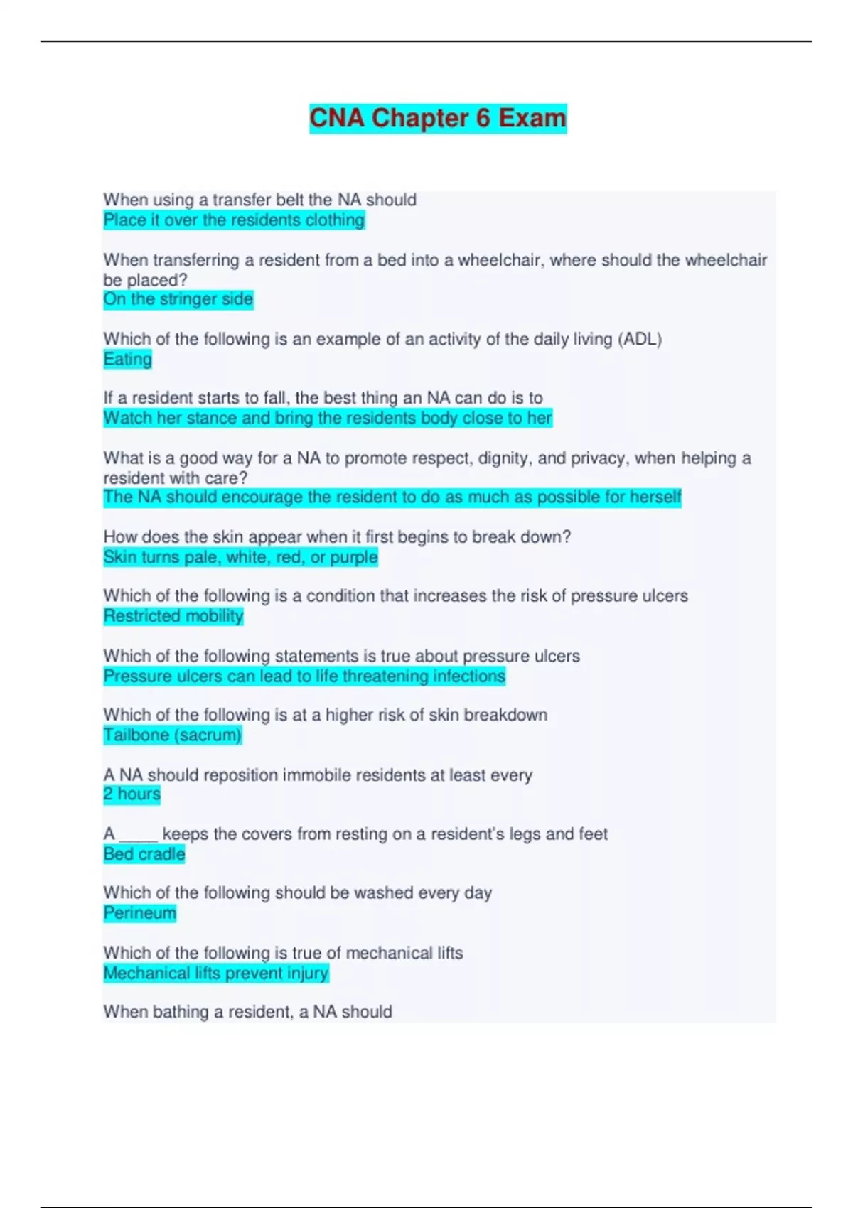 Certified Nursing Assistant | CNA Chapter 6 Exam - Questions and Answers When using a transfer belt the NA should Place it over the residents clothing When transferring a resident from a bed into a wheelchair, where should the wheelchair be placed? On the stringer side Which of the following is an example of an activity of the daily living (ADL) Eating If a resident starts to fall, the best thing an NA can do is to Watch her stance and bring the residents body close to her What is a good way for a NA to promote respect, dignity, and privacy, when helping a resident with care? The NA should encourage the resident to do as much as possible for herself How does the skin appear when it first begins to break down? Skin turns pale, white, red, or purple Which of the following is a condition that increases the risk of pressure ulcers Restricted mobility Which of the following statements is true about pressure ulcers Pressure ulcers can lead to life threatening infections Which of the following is at a higher risk of skin breakdown Tailbone (sacrum) A NA should reposition immobile residents at least every 2 hours A ____ keeps the covers from resting on a resident’s legs and feet Bed cradle Which of the following should be washed every day Perineum Which of the following is true of mechanical lifts Mechanical lifts prevent injury When bathing a resident, a NA should